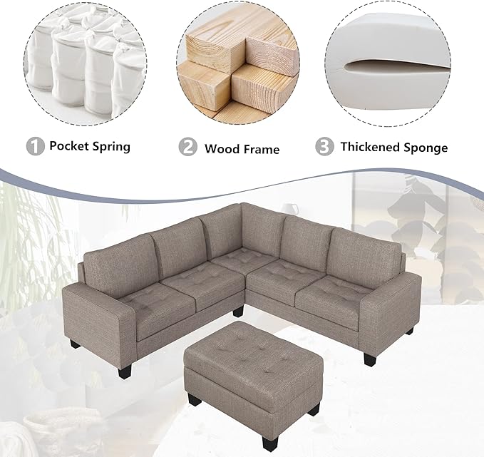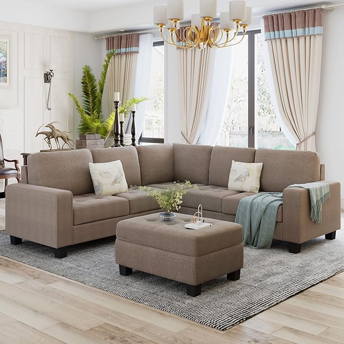 Sectional Couch Modular 5 Seater, Combination Corner, Linen L-Shaped Sofa, Saving Design with Storage Footrest and Cup Holder, for Large Space Dormitory Apartments, Brown