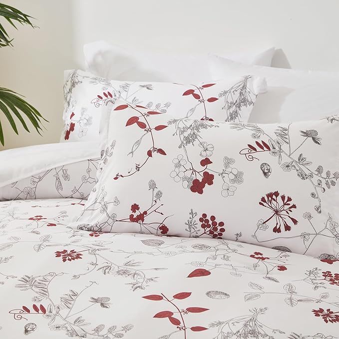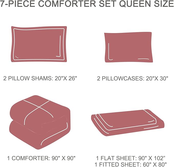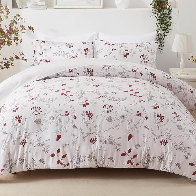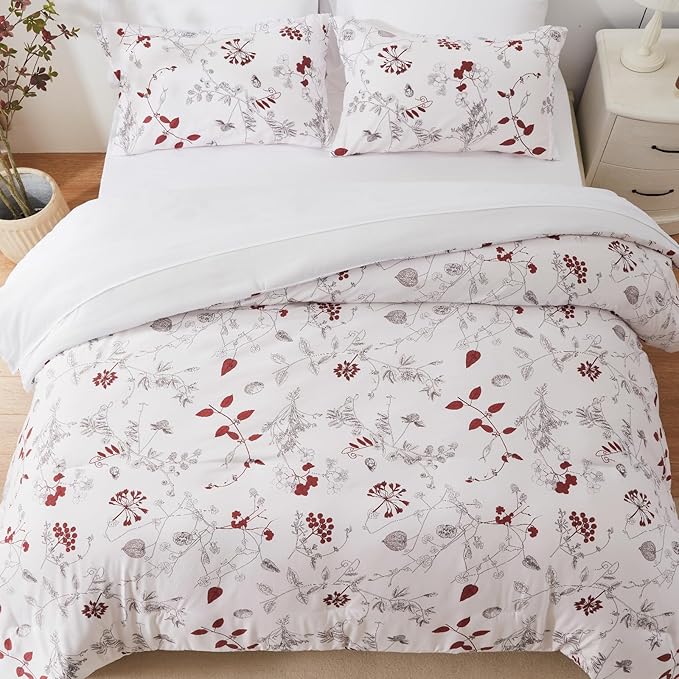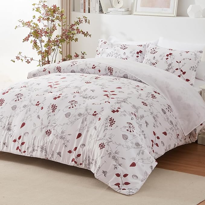 EMME Queen Comforter Set - Red Floral Bedding Set 7 PCS with Flowers Leaves Pattern, Soft Plant Printed Botanical Bed Set with Sheets, Fluffy Bed Bag for All Season(90"X90")