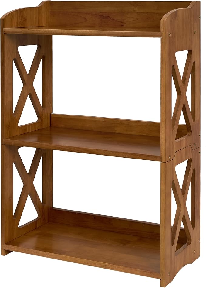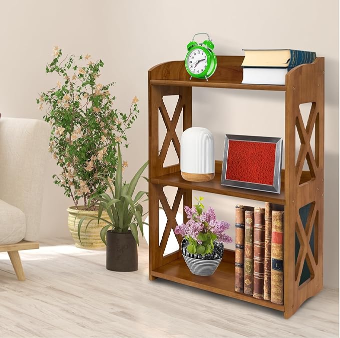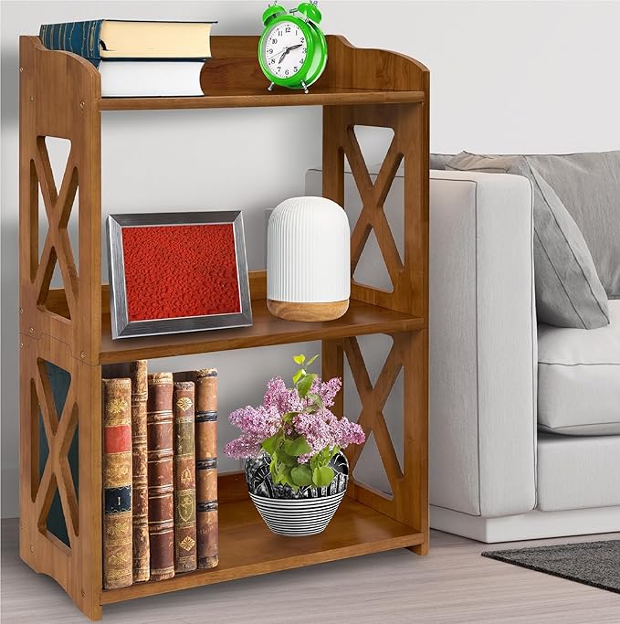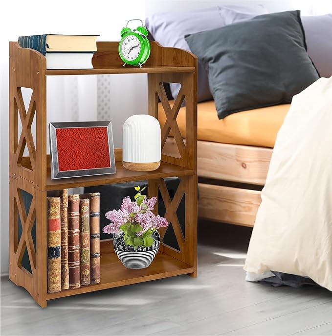 Side Table 3 Tier Bookshelf, Natural Wood Bookcase with Storage Shelf, Table Nightstand, Small Bookshelf, Open Bookcase, Display Rack for Office, Bedroom, Living Room and Kitchen (Brown)