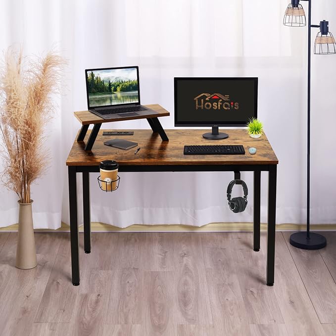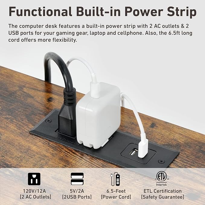 About This ×【Functional Built-in Power Strip】Hosfais computer desk features a built-in power strip with 2 AC outlets & 2 USB...