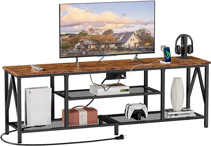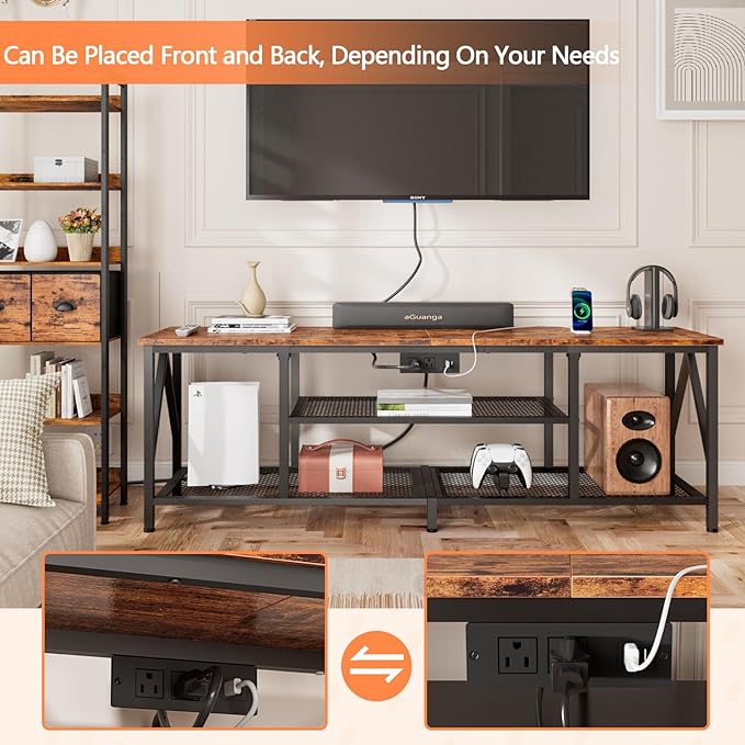 Furologee TV Stand with Power Outlets for 65 70 inch TV, Entertainment Center with Open Storage Shelves, Long 63'' TV Media Console Table with Soundbar Shelf for Living Room, Bedroom, Rustic Brown