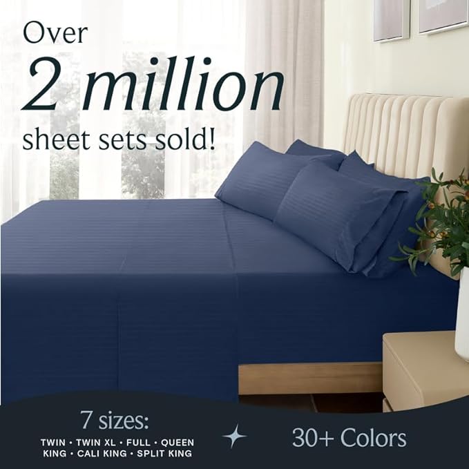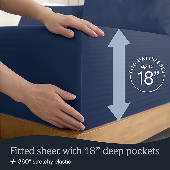 LuxClub 6 PC Cal King Size Sheet Set Bed Sheets, Breathable Luxury Bed Sheets, Deep Pockets 18" Wrinkle Free Cooling Bed Sheets Machine Washable Hotel Bedding (Cal King, Striped Navy)