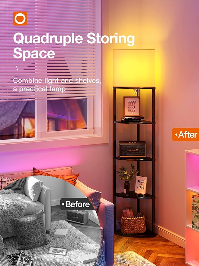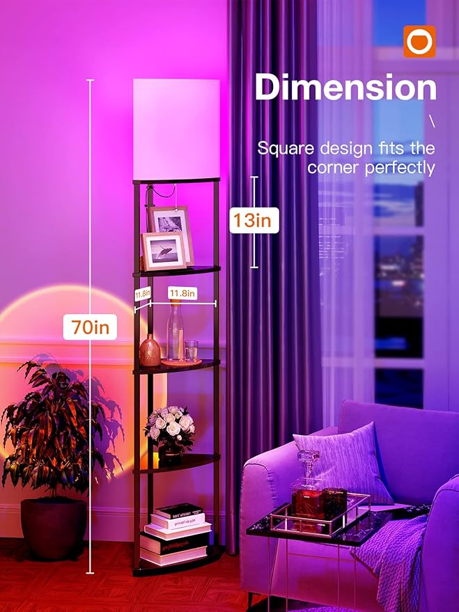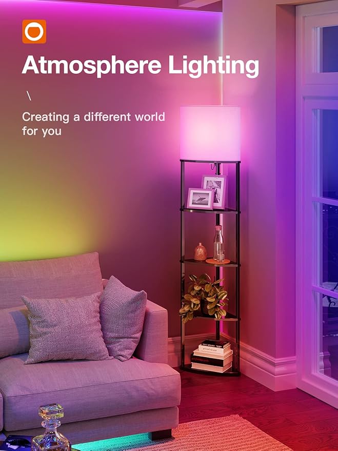 addlon Smart 5-Tier Shelf Floor Lamp with RGB Bulb and White Lamp Shade - Corner Display Floor Lamps with Shelves for Living Room, Bedroom and Office - Black