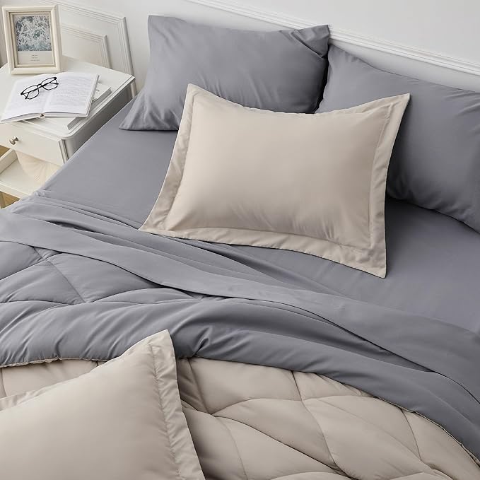 Bedsure Beige Full Comforter Set - 7 Pieces Reversible Bed Set Bed in a Bag Full with Comforters, Sheets, Pillowcases & Shams, Full Bedding Sets