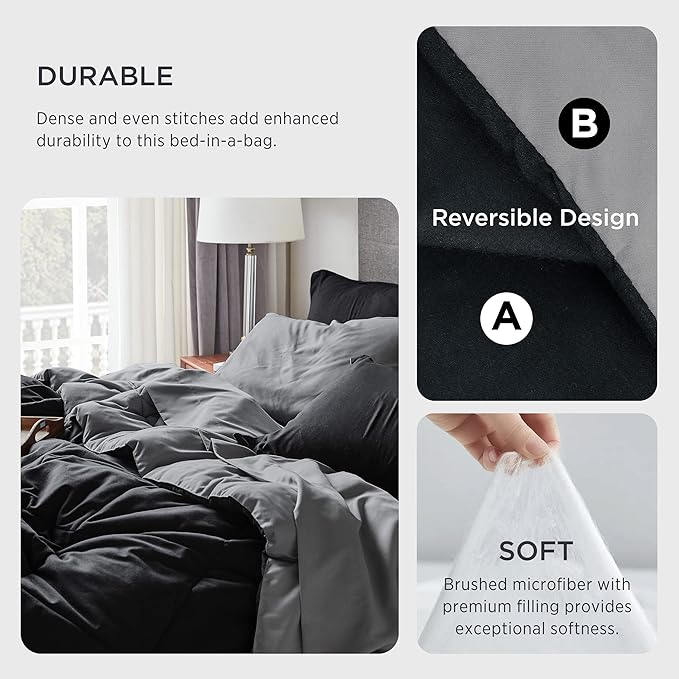 Bedsure Black California King 7 Pieces Reversible Bed Set Bed in a Bag with Comforters, Sheets, Pillowcases & Shams, Bedding Sets