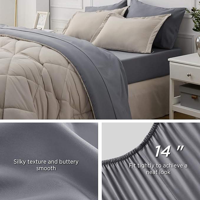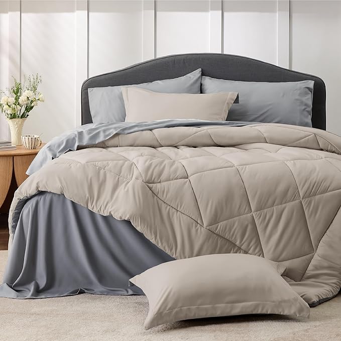 Bedsure Beige Comforter Set - 7 Pieces Reversible Bed in a Bag with Comforters, Sheets, Pillowcases & Shams, Bedding Sets