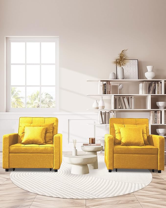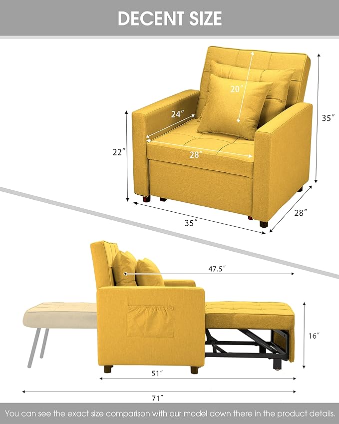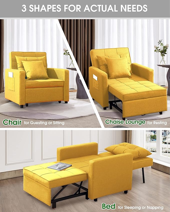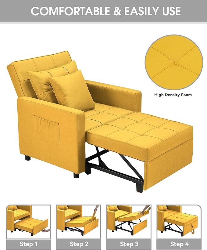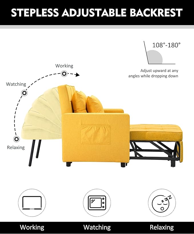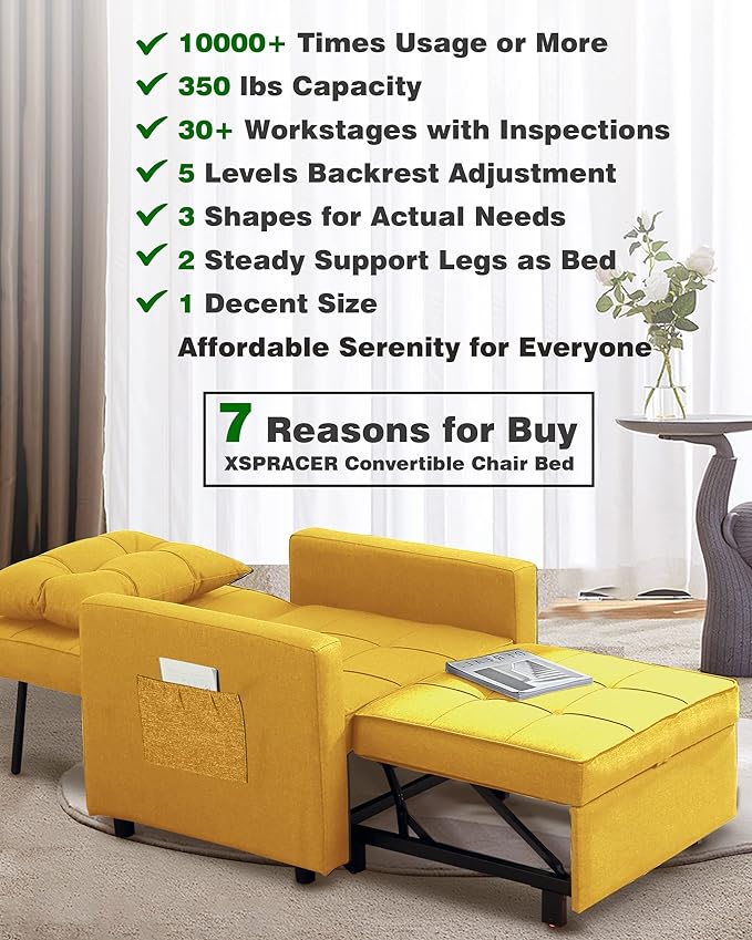 XSPRACER [UPDATED] Convertible Chair Bed, Sleeper Chair Bed 3 in 1, Stepless Adjustable Backrest,Armchair, Sofa, Bed, Linen, Yellow, Single One