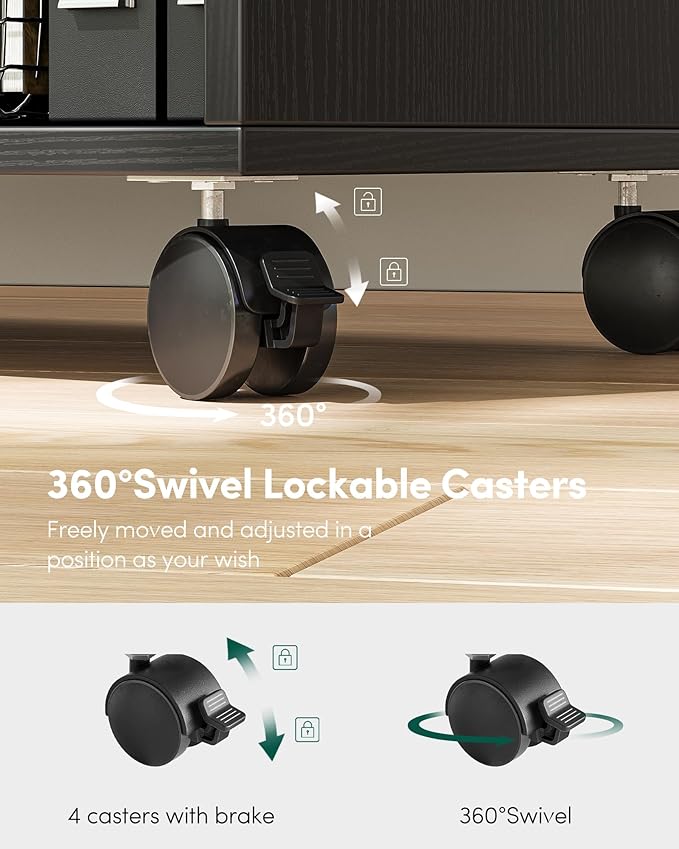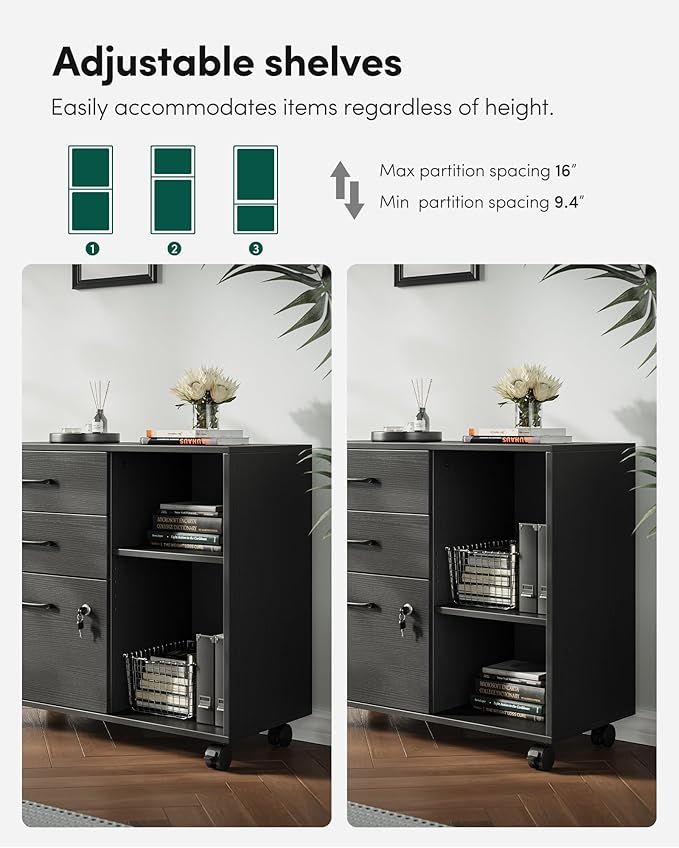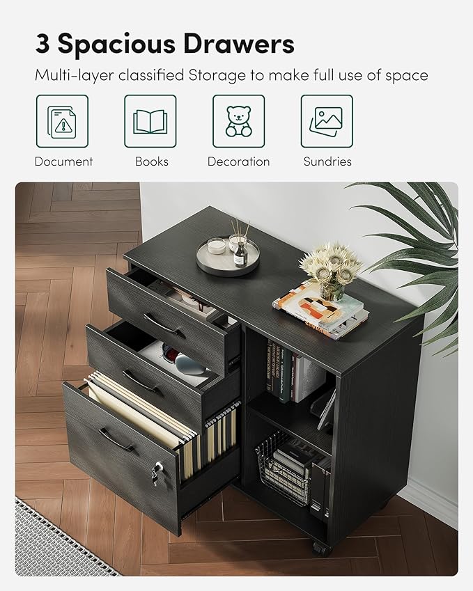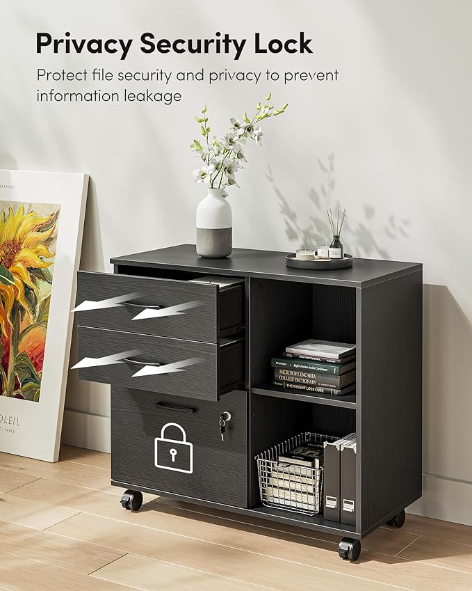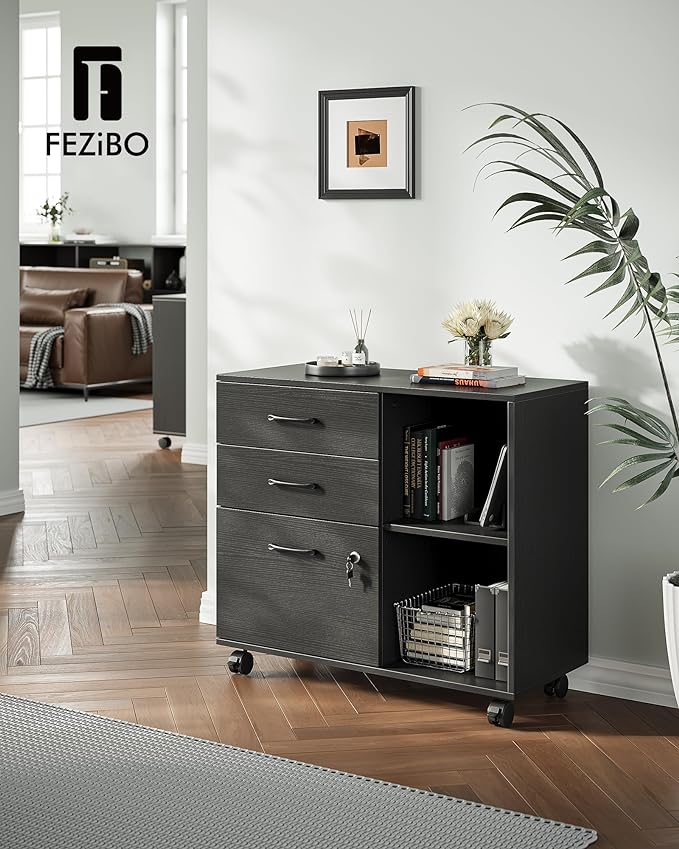 FEZIBO 3-Drawer Mobile File Cabinet, Lateral Filing Cabinet with Lock, Printer Stand with Open Storage Shelves for Home Office, Filing Cabinets for Home Office, Black