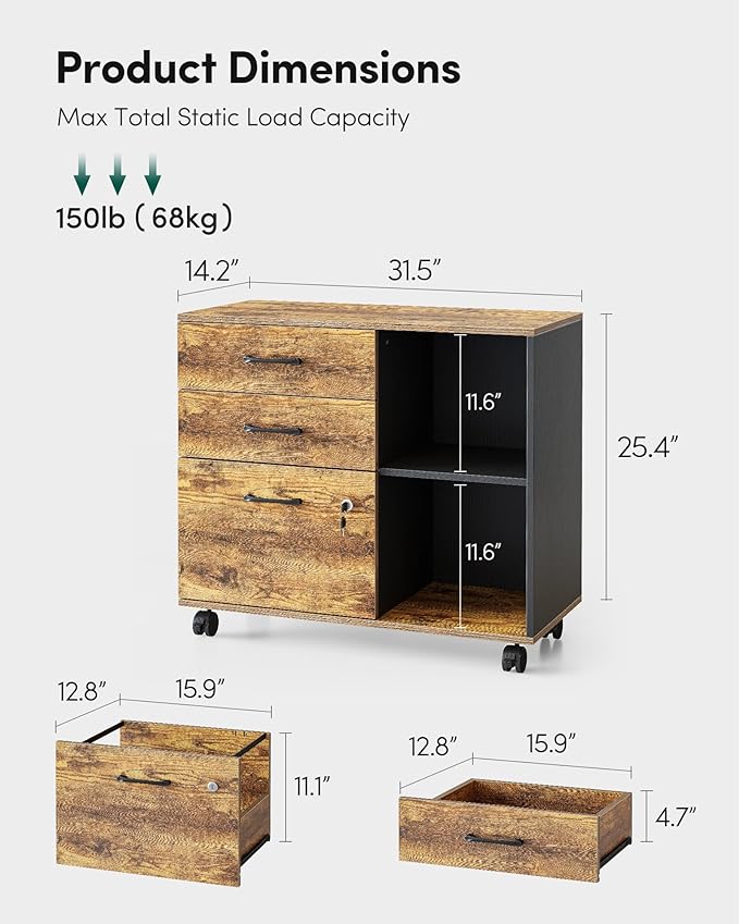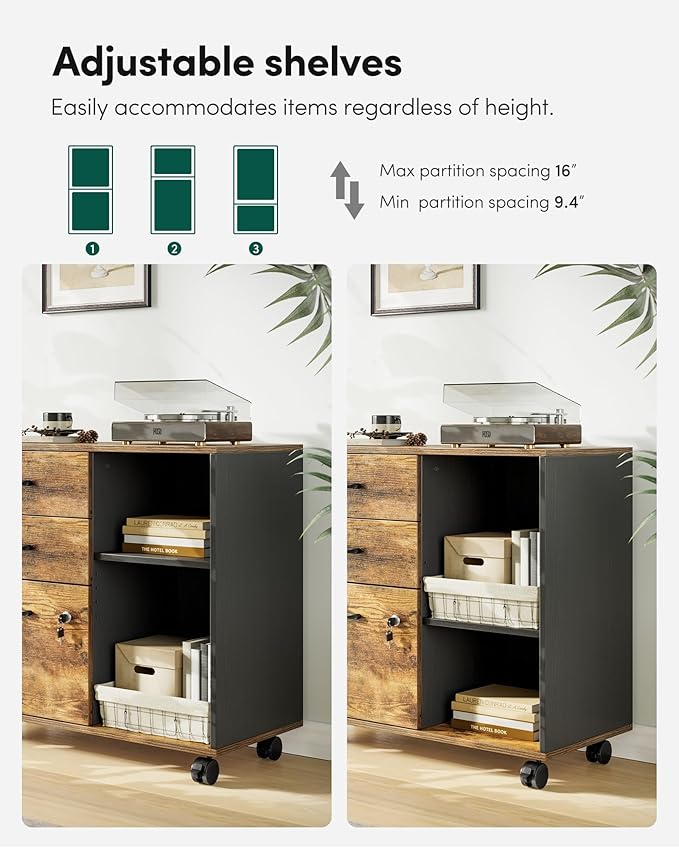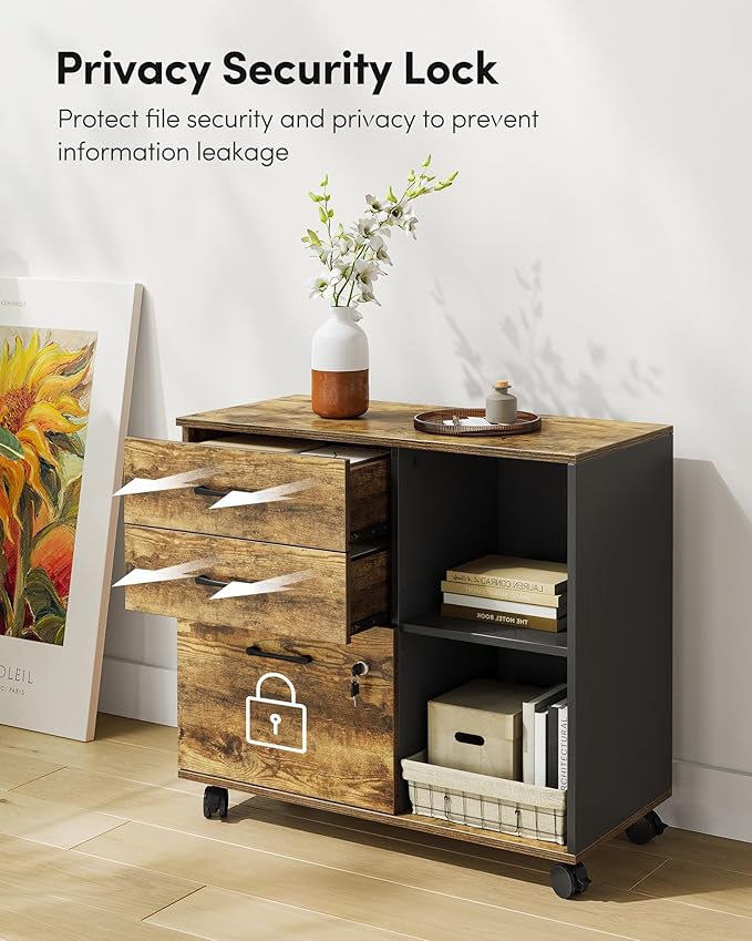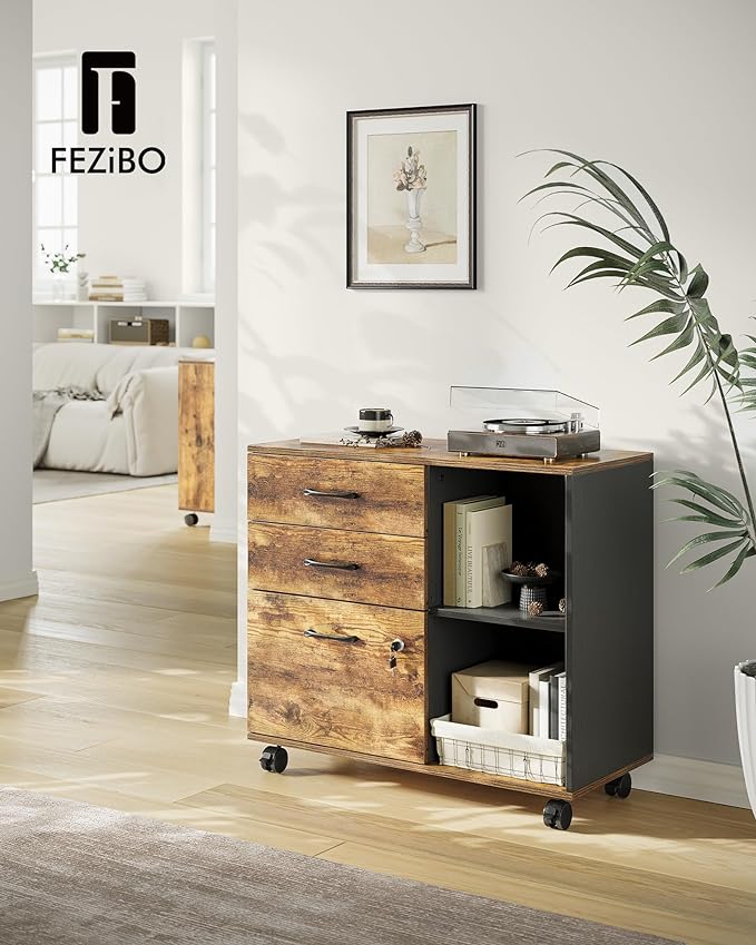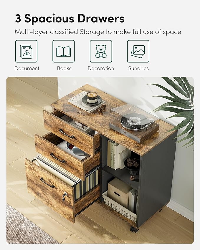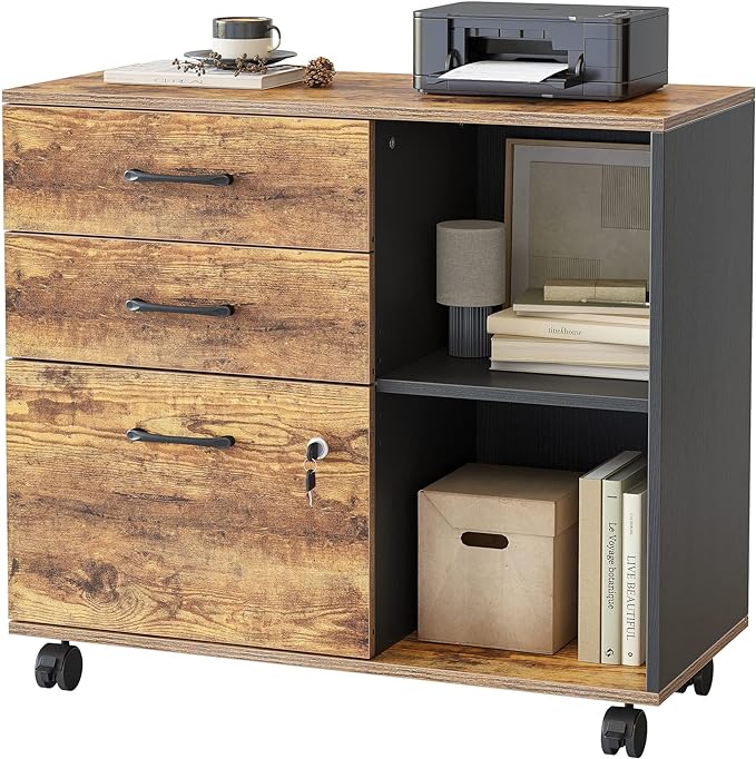 FEZIBO 3-Drawer Mobile File Cabinet, Lateral Filing Cabinet with Lock, Printer Stand with Open Storage Shelves for Home Office, Filing Cabinets for Home Office, Vintage&Black