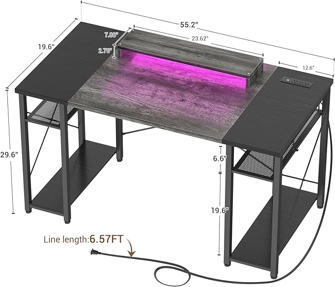 armocity Computer Desk with LED Lights, 55 Inch Desk with Power Outlet and USB, Reversible Large Desk with Moveable Monitor Stand, 55.2'' Gaming PC Table for Home Office, Workstation, Grey and Black