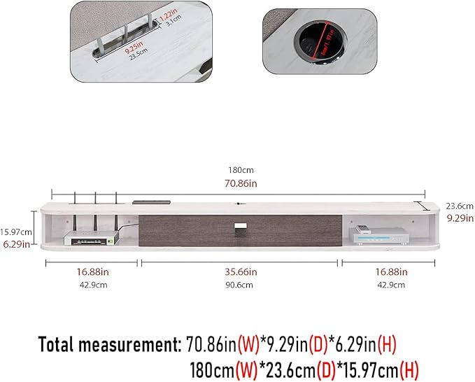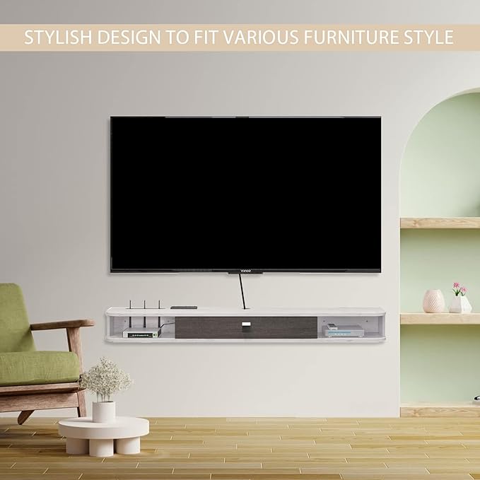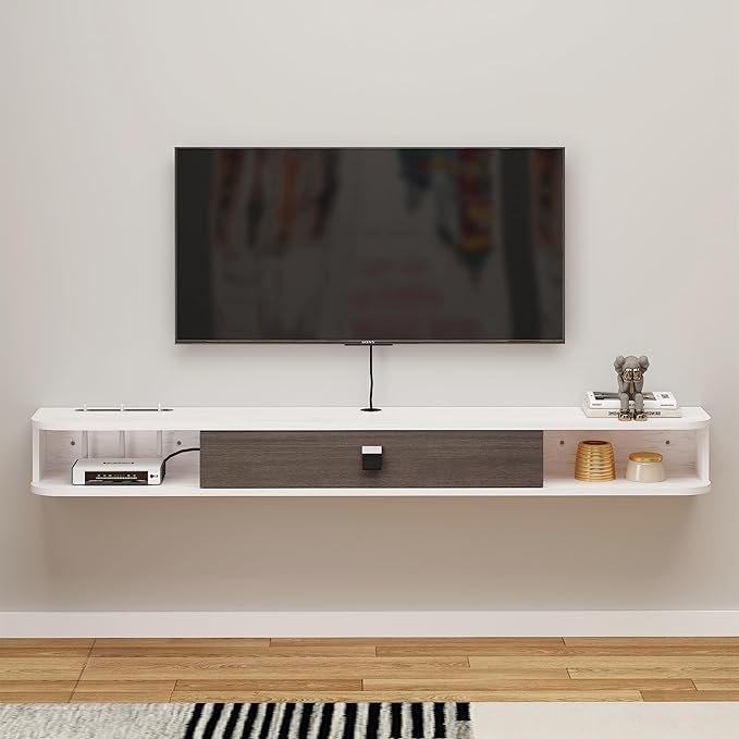 Floating TV Unit, 71'' Wall Mounted TV Cabinet, Floating Shelves with Door, Modern Entertainment Media Console Center Large Storage TV Bench for Living Room & Office (70.86IN, Grey White)