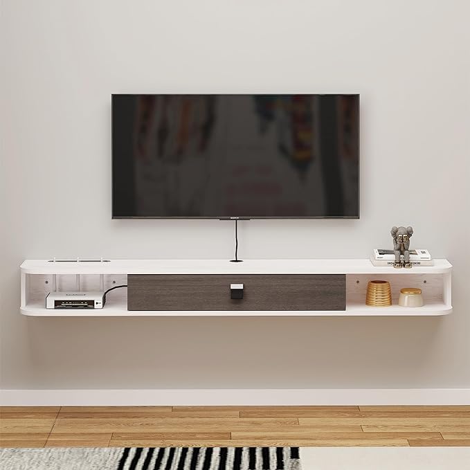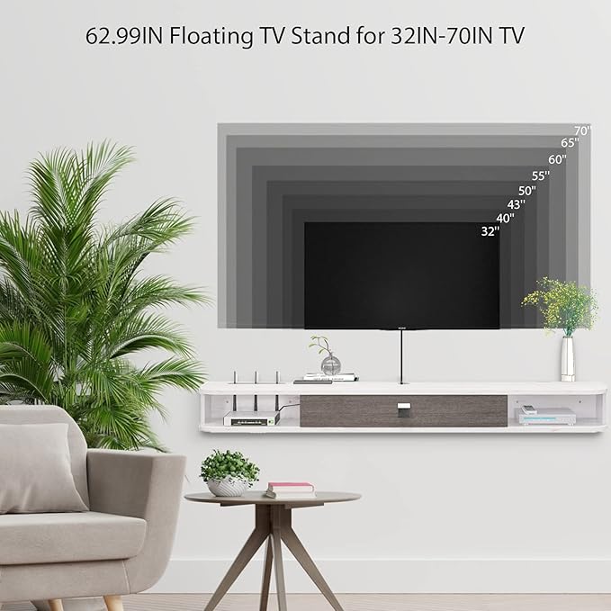 Floating TV Unit, 63'' Wall Mounted TV Cabinet, Floating Shelves with Door, Modern Entertainment Media Console Center Large Storage TV Bench for Living Room & Office (62.99IN, Grey White)