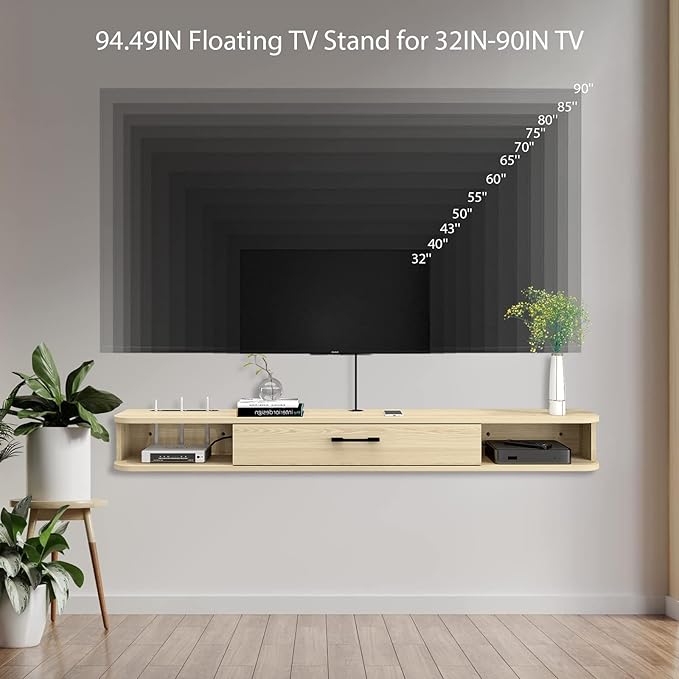 Floating TV Unit, 95'' Wall Mounted TV Cabinet, Floating Shelves with Door, Modern Entertainment Media Console Center Large Storage TV Bench for Living Room & Office (94.49IN, Oak)