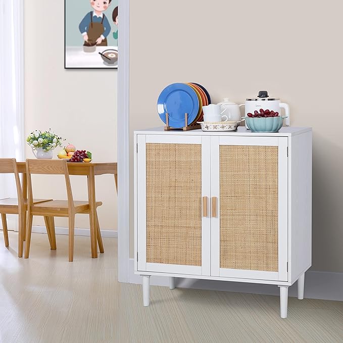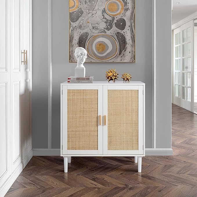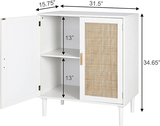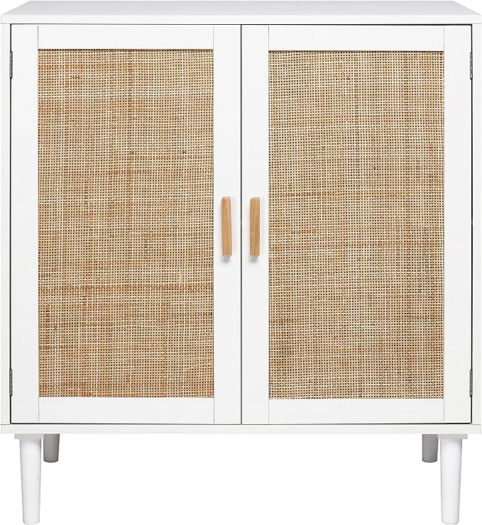 Finnhomy Sideboard Buffet Storage Liquor Cabinet with Rattan Decorated Doors, Kitchen, Dining Room, Hallway, Cupboard Console Table, Accent Cabinet, 31.5X 15.8X 34.6 Inches, White
