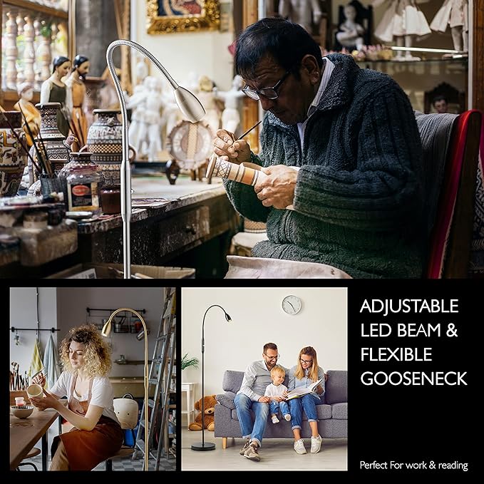 O’Bright Ray – Adjustable LED Beam Floor Lamp, Dimmable and Zoomable Spotlight, Flexible Gooseneck, Reading/Crafting Standing Lamp, Work Table Light, Brushed Nickel