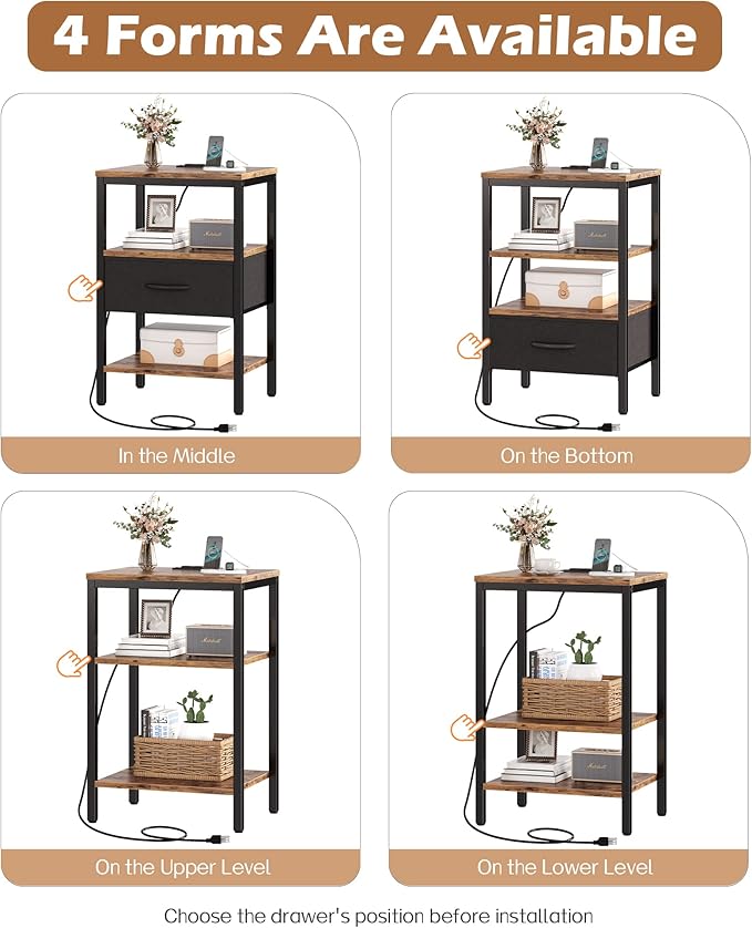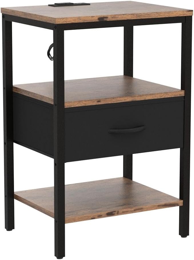 SUPERJARE Nightstand Set of 2, Bed Side Tables with Charging Station, Adjustable Fabric Drawer, Night Stand for Bedroom, 3-Tier Storage End Tables, for Living Room, Rustic Brown and Black