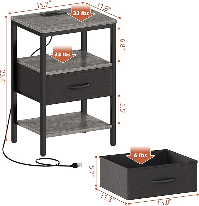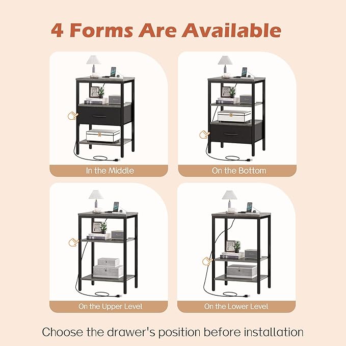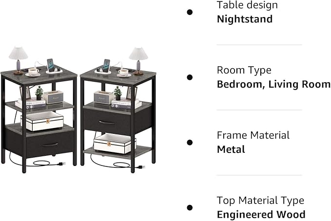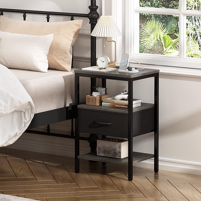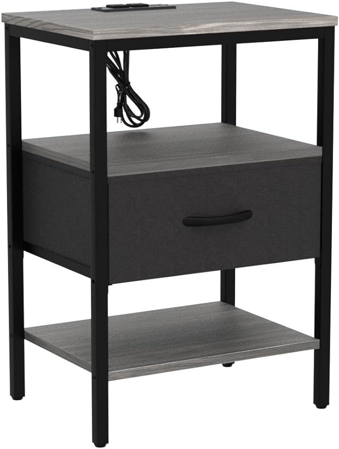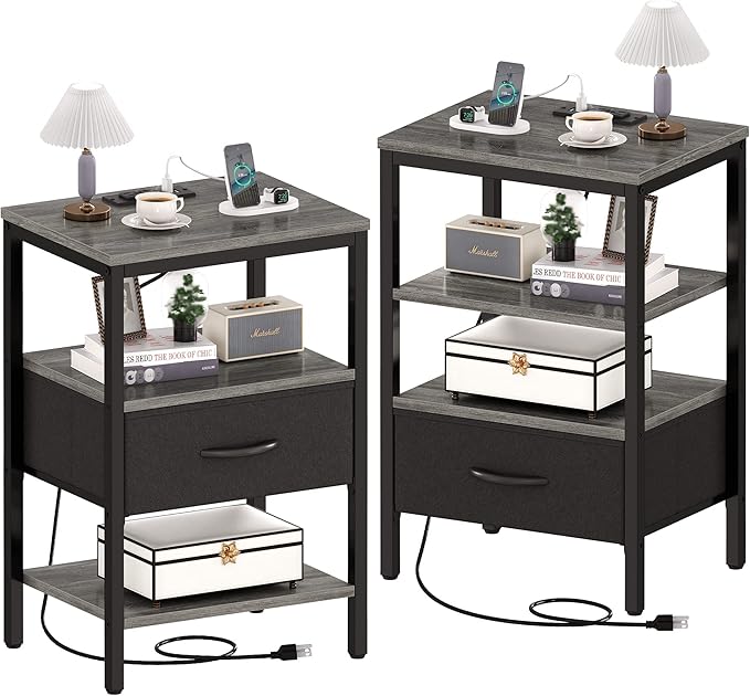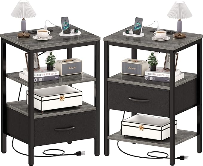 SUPERJARE Nightstand Set of 2, Bed Side Tables with Charging Station, Adjustable Fabric Drawer, Night Stand for Bedroom, 3-Tier Storage End Tables, for Living Room - Charcoal Gray