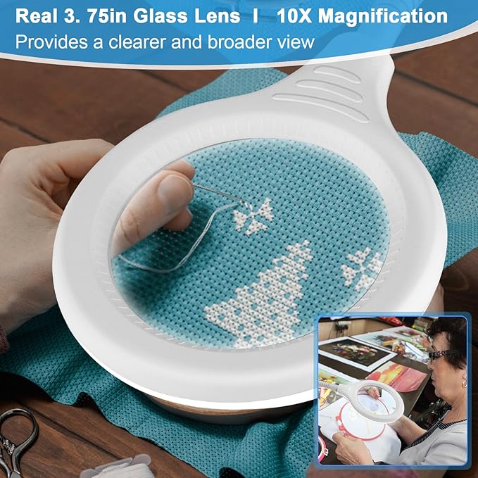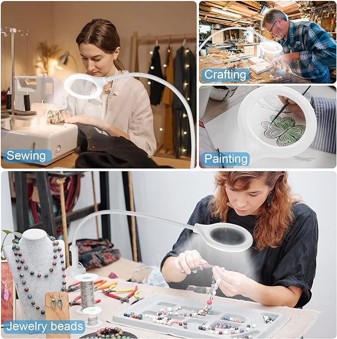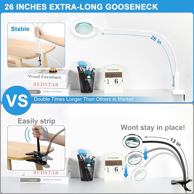 26" Gooseneck Magnifying Lamp with Clamp, 5 Color Modes Stepless Dimmable LED Desk Light with Magnifying Glass, 10X Real Glass Lighted Magnifier Hands Free for Painting Close Work Craft Hobby