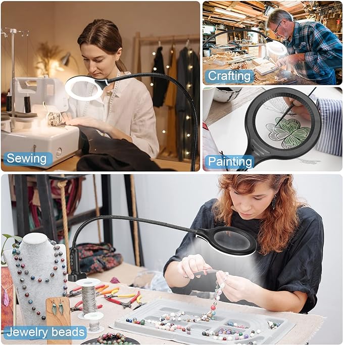 26" Gooseneck Magnifying Lamp with Clamp, 5 Color Modes Stepless Dimmable LED Desk Light with Magnifying Glass, 10X Real Glass Lighted Magnifier Hands Free for Painting Close Work Craft Hobby
