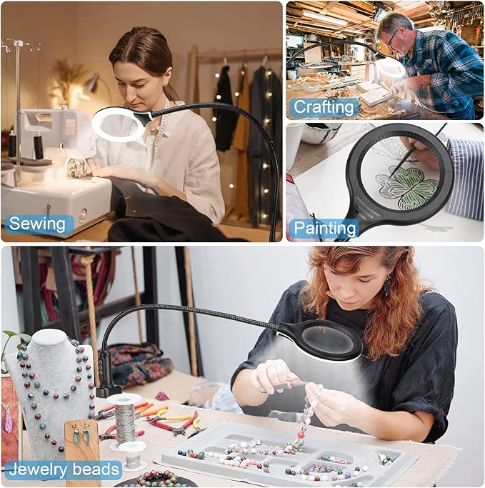 26" Gooseneck Magnifying Lamp with Clamp, 5 Color Modes Stepless Dimmable LED Desk Light with Magnifying Glass, 8X Real Glass Lighted Magnifier Hands Free for Painting Close Work Craft Hobby