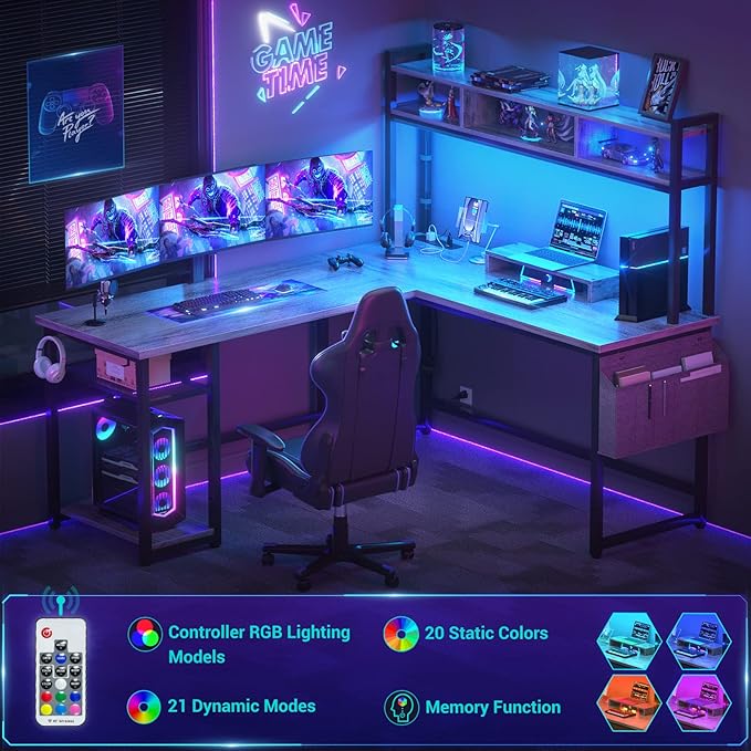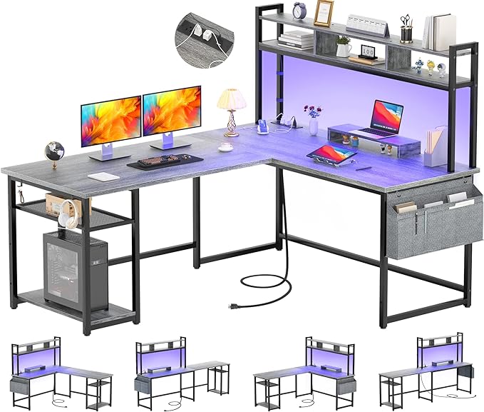 Aheaplus L Shaped Desk with Power Outlet & LED Strip, Reversible L-Shaped Corner Computer Desks Gaming Desk with Storage Shelf & Monitor Stand, Modern 2 Person Home Office Desk Writing Desk, White Oak