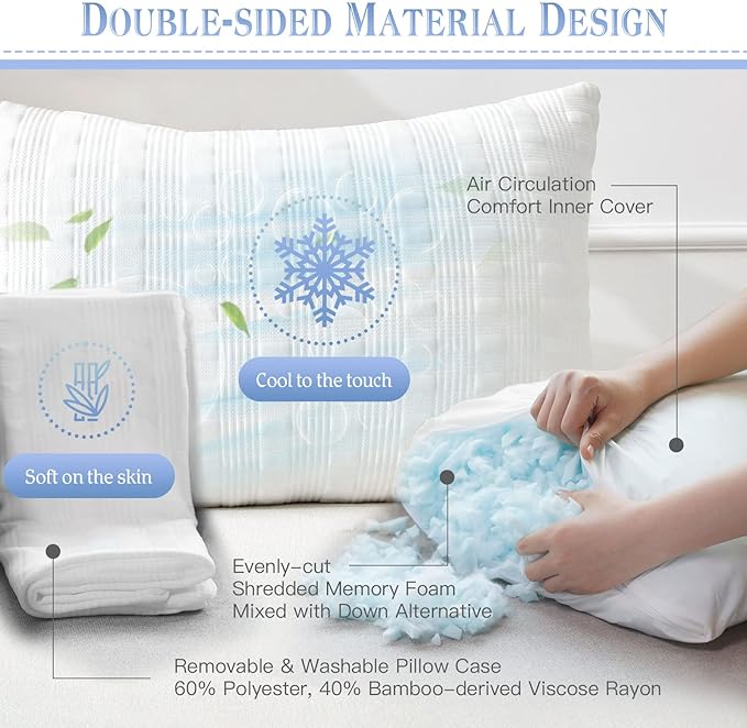 Cooling Pillows for Sleeping King Size Set of 2,Shredded Memory Foam Bed Pillow with Pillow Case-Double Sided Material,Adjustable Loft King Pillow for Side & Back Sleeper-Medium Firm