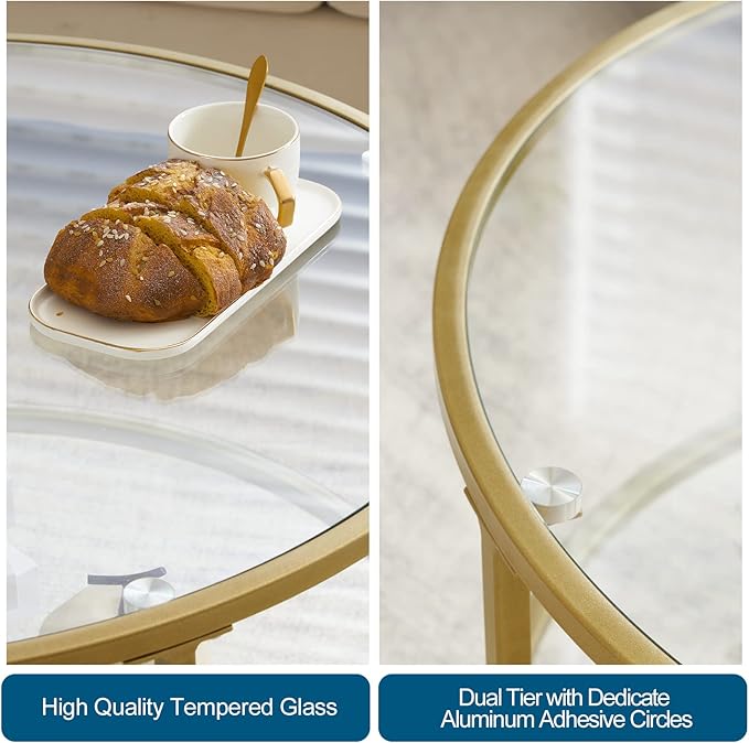 VINGLI Glass Coffee Table, 30" Round Champagne Gold Coffee Tables for Living Room,2-Tier Glass Top Coffee Table with Storage Clear Coffee Table,Simple & Modern Center Table Mesa de Centro Para Sala