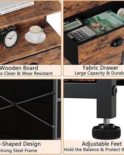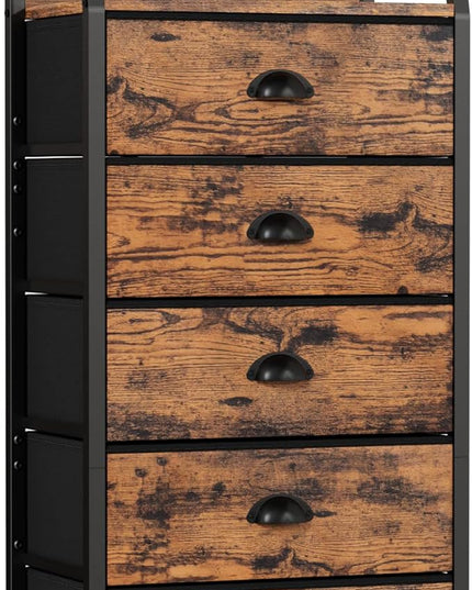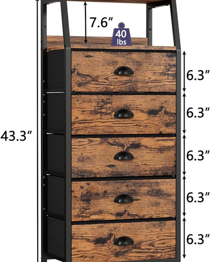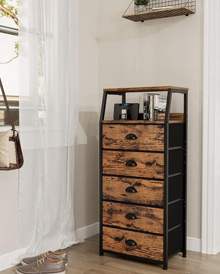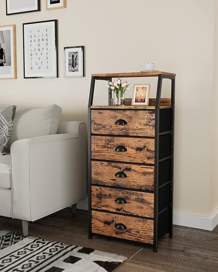 Furnulem Tall 5 Drawers Dresser, Vertical Storage Tower Fabric Dresser for Bedroom, Hallway, Entryway, Nursery, Closet Organizer, Nightstand Bedside Table Furniture, Sturdy Steel Frame, Wood Top