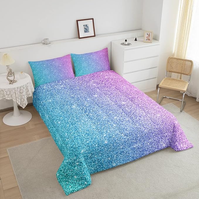 Colorful Glitter Bedding King Girly Turquoise Teal Blue Pink Pastel Girls Comforter Set 3 Pcs Trendy Quilt Duvet for Kid Women Down Comforter with Sparkle Sequin Pattern Bling Bedroom Decor Bed Cover