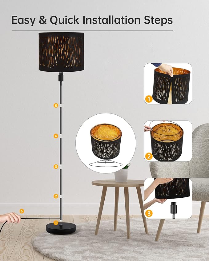 About This š”ćEasy Assembly and premium qualityćMade with a whloe black metal body and cutout lampshade, the industrial floor lamp...
