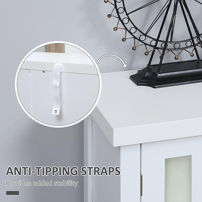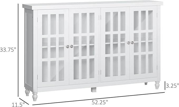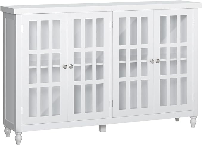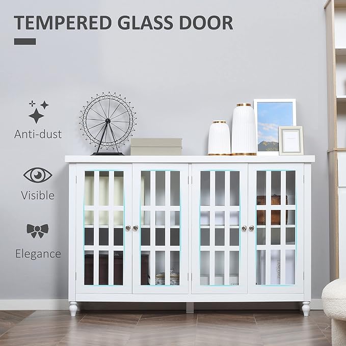 HOMCOM Sideboard, Buffet Cabinet with 4 Tempered Glass Doors, Stripe Pattern and Adjustable Storage Shelf, Credenza, White
