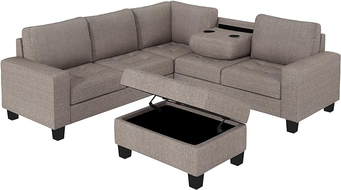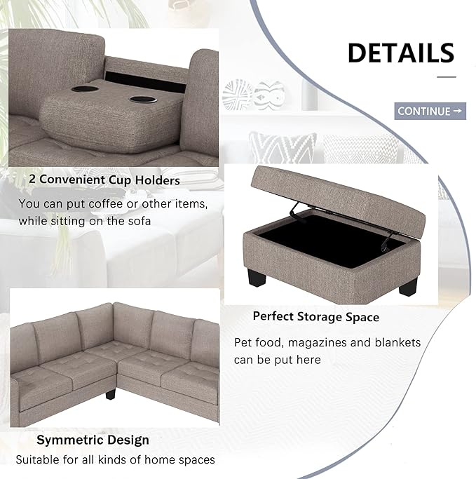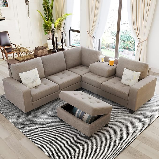 Ottoman&Cup Living Room Furniture Sets,Sectional Corner Sofa L-shape Couch Saving with Storage Ottoman & Cup Holders Design for Large Space Dorm Apartment, Brown F
