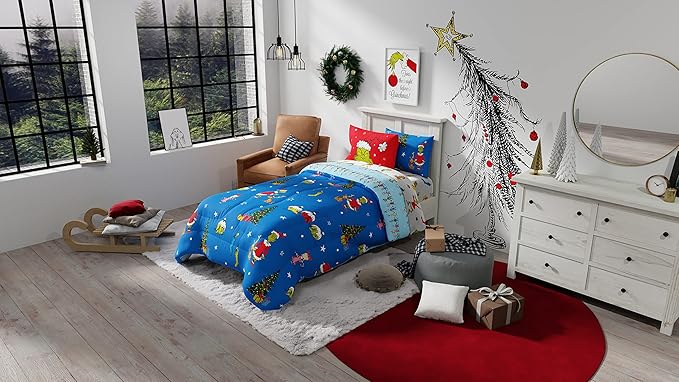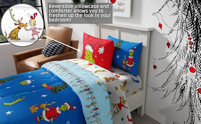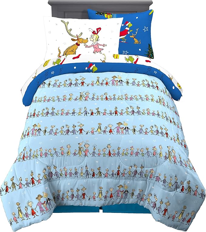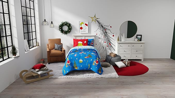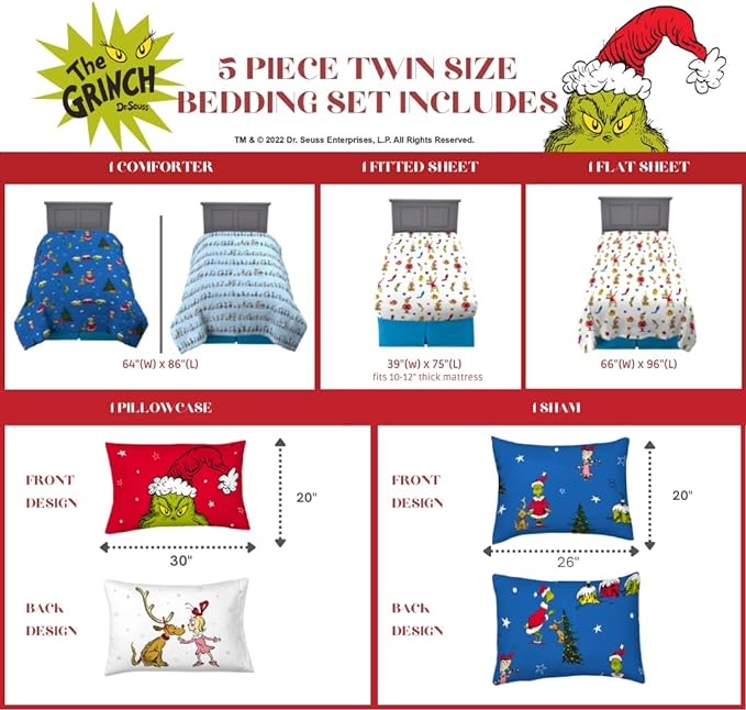 Franco Grinch by Dr. Seuss Holiday & Christmas Bedding Soft Comforter and Sheet Set with Sham, 5 Piece Twin Size, (Official Dr. Seuss Product)