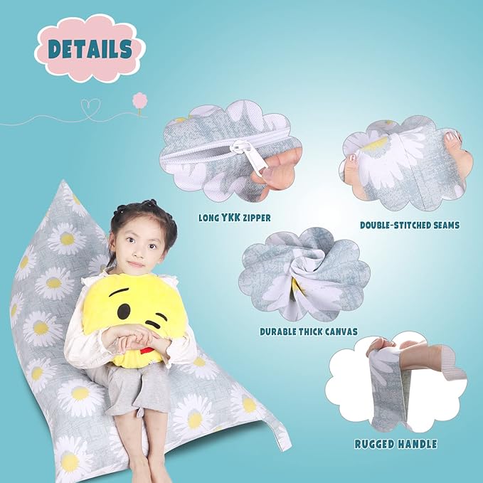 Stuffed Animal Storage Bean Bag Chair Cover, Canvas Daisy Plush Toy Storage Stuff and Sit Seat for Kids/Teens/Adults, 52" x 31" Extra Large Triangle Floor Sofa Lounger, 200L/52Gal, Cover Only