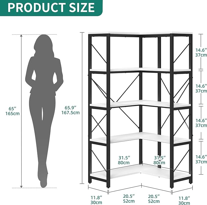 YITAHOME Corner Bookshelf, 5-Tier L-Shaped Bookcase Storage Organizer, Tall Open Display Freestanding Storage Rack Modern Book Shelf for Living Room, Bedroom, Home Office, White