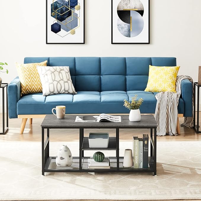 VECELO Coffee Center Table with Storage for Living Room Office Reception, Modern & Industrial Mesh Shelf, 39.4 Inch, Charcoal Gray
