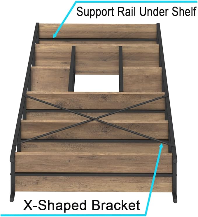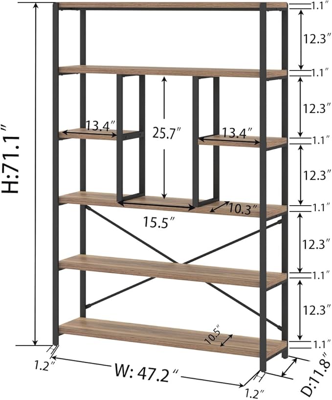 LVB Tall Industrial Etagere Bookcase, Modern Wood Large Open 6 Tier Bookshelf, Vintage Wide Metal Book Shelf Organizer, Farmhouse Book Shelves for Bedroom Living Room Home Office Storage, Rustic Oak