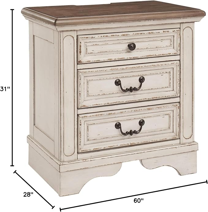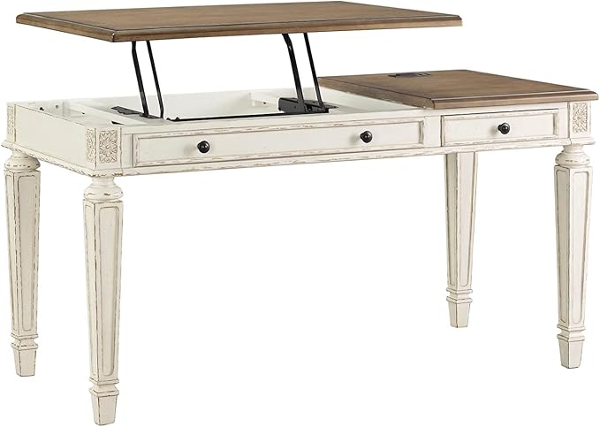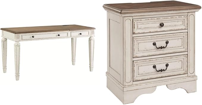 Signature Design by Ashley Realyn French Country 60" Home Office Lift Top Desk with USB Charging, Chipped White and 3 Drawer Nightstand with Electrical Outlets & USB Ports, Chipped White