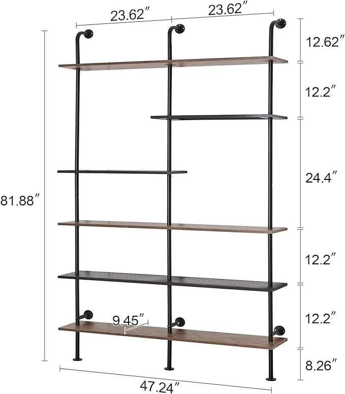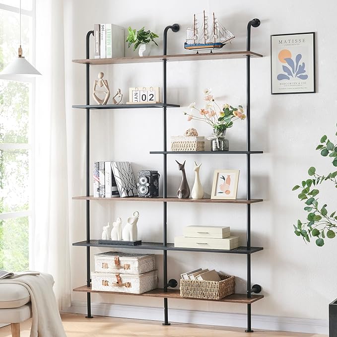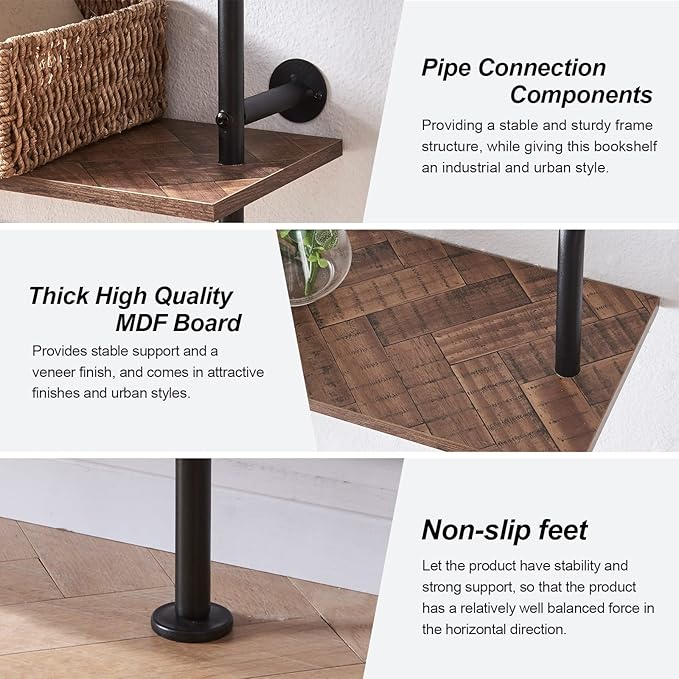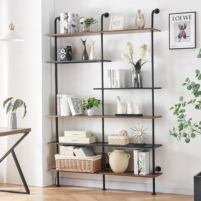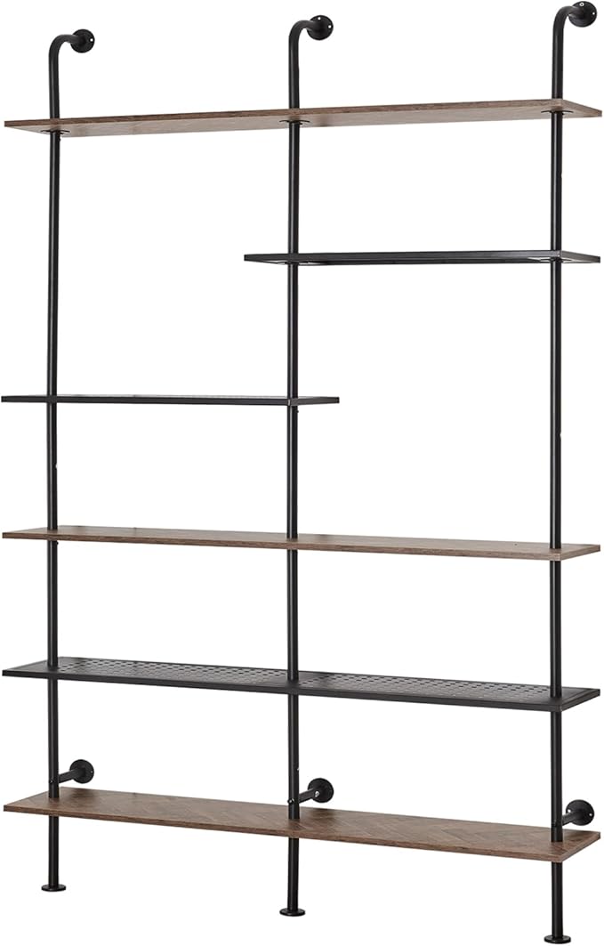 HOMISSUE Industrial Bookshelf 6-Tier Open Wall Mount Ladder Bookshelf, Modern Bookcase with Metal Frame and Wood Style for Home Office, Wall Mounted industrial Iron Pipe Shelf, Brown