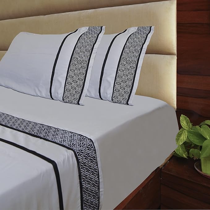 Luxury 100% Egyptian Cotton Queen Sheet Set - 1000 Thread Count - 4 PC Fitted and Flat Sheets, Extra Cooling Long Staple Hotel-Quality Bedding with Sateen Weave - Black Embroidered Light Grey Sheets