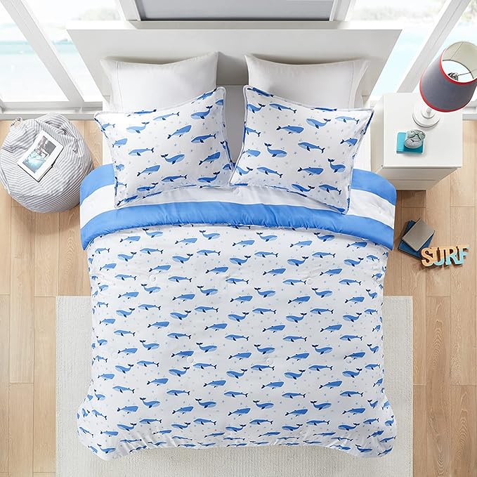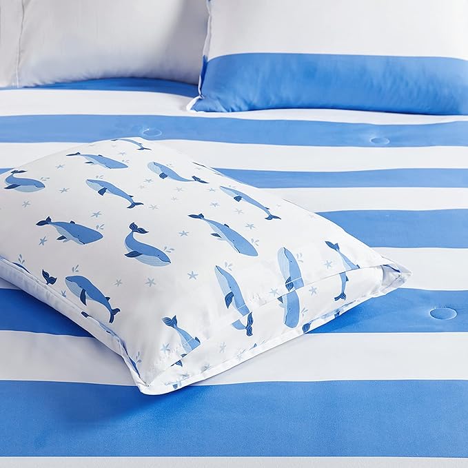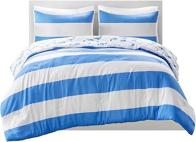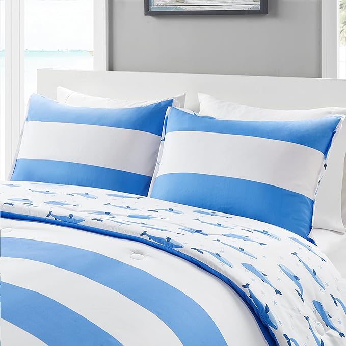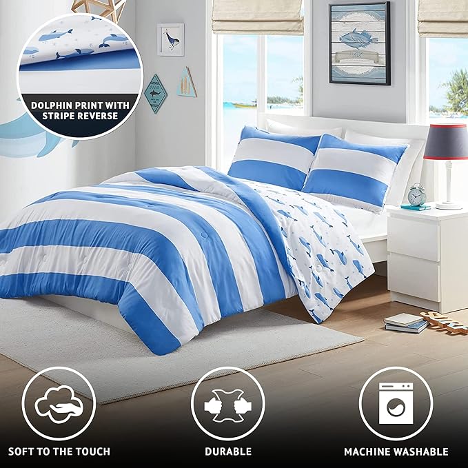 Mizone Kids Blake Reversible Dolphin Comforter Set - Adventure Animal Adorable Print with Stripe Reverse, Fun Bedroom Décor, Modern All Season Kids Bedding, Matching Sham, Blue 2 Piece, Full/Queen