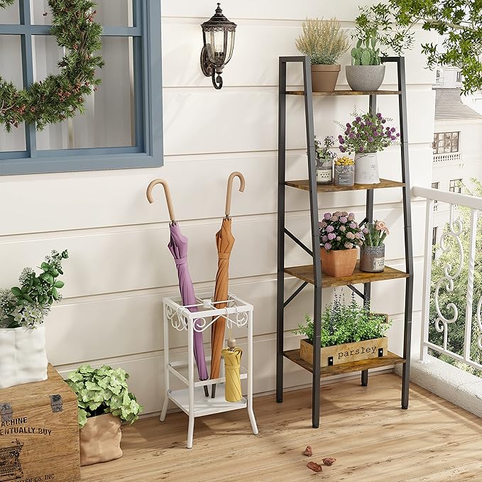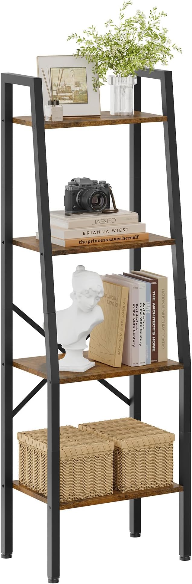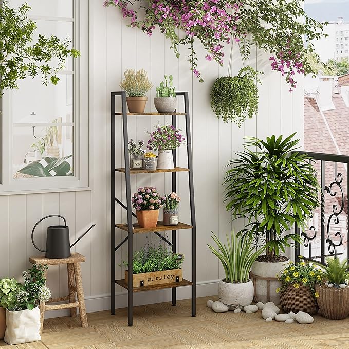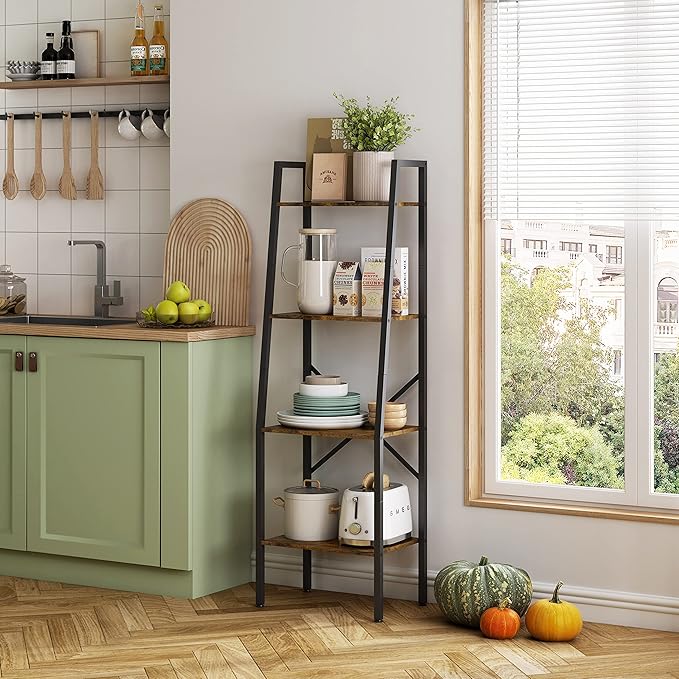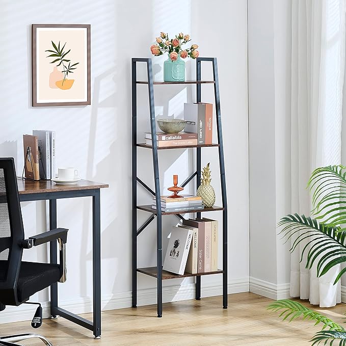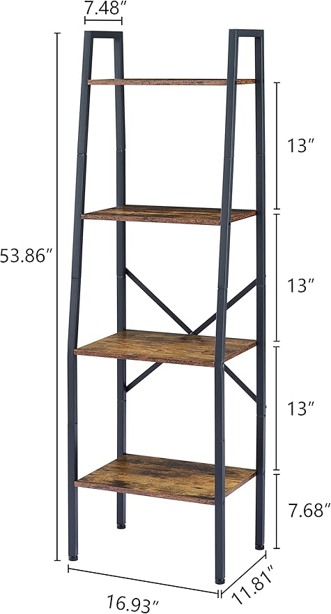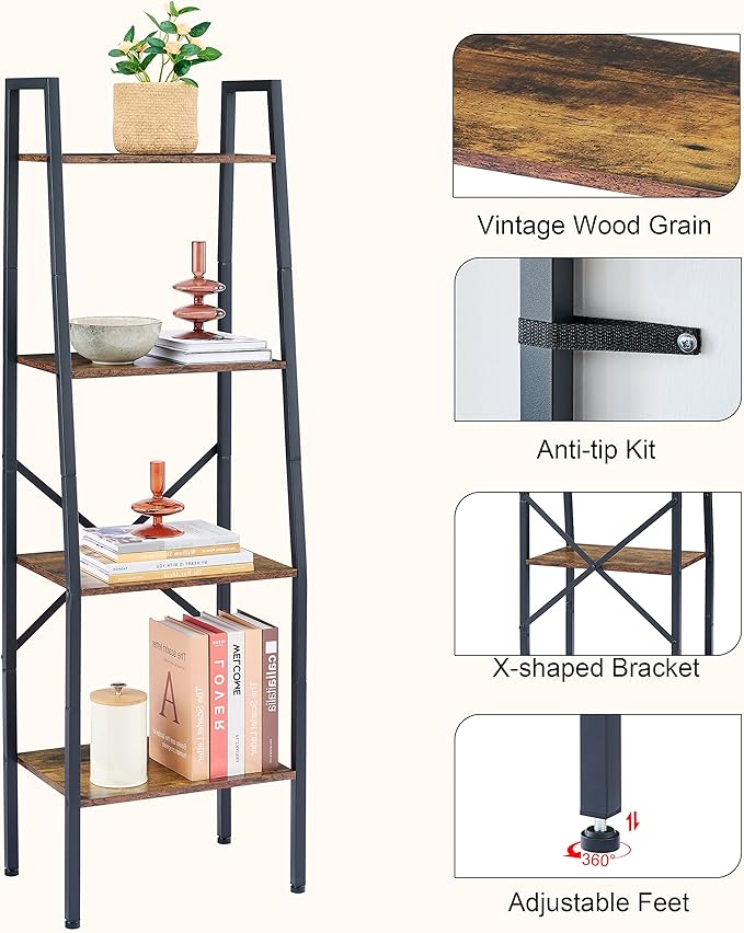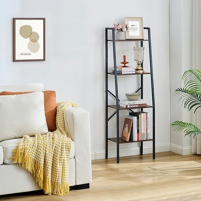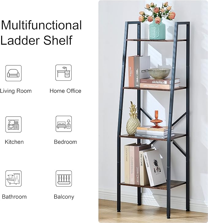 Hoctieon Ladder Shelf Bookcase, 4-Tier Industrial Tall Ladder Bookshelf with Metal Frame for Living Room, Kitchen, Home Office, Bedroom, Rustic Brown