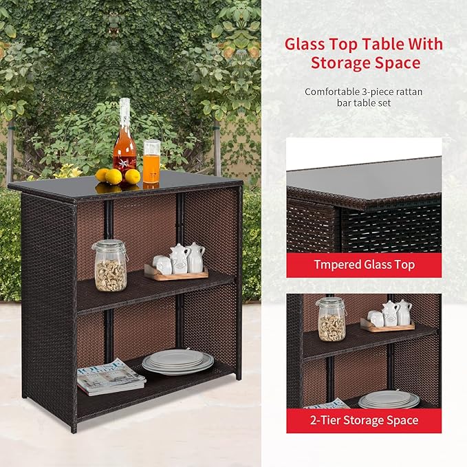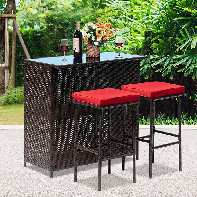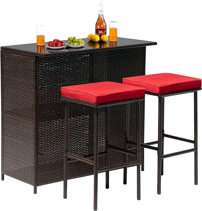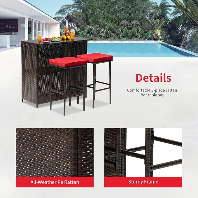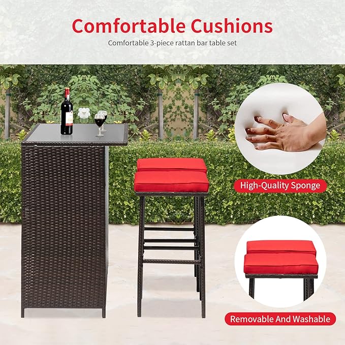 FDW Outdoor Furniture Set Wicker Bistro Set 3PCS Patio Bar Set with Two Stools for Patio Backyard Balcony,Red Cushion