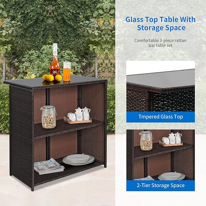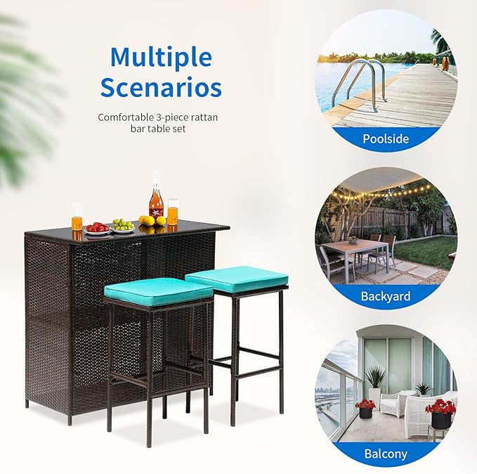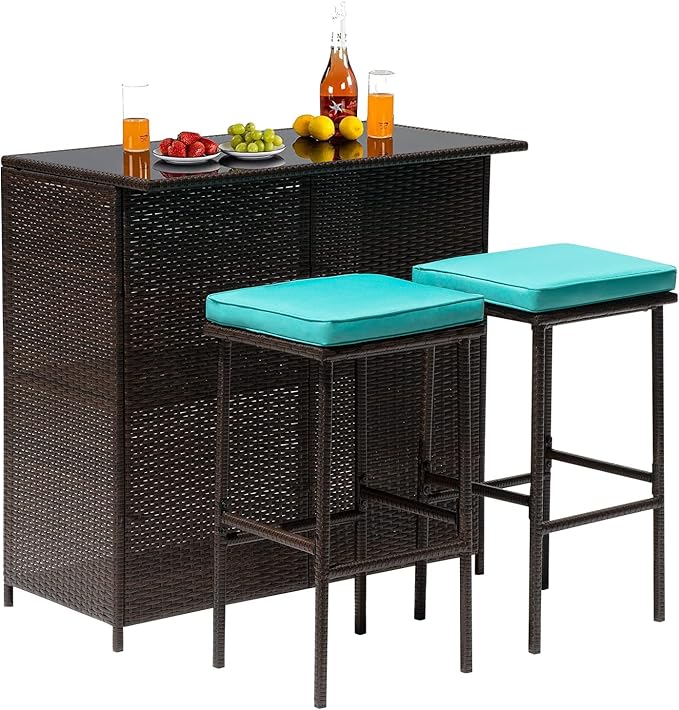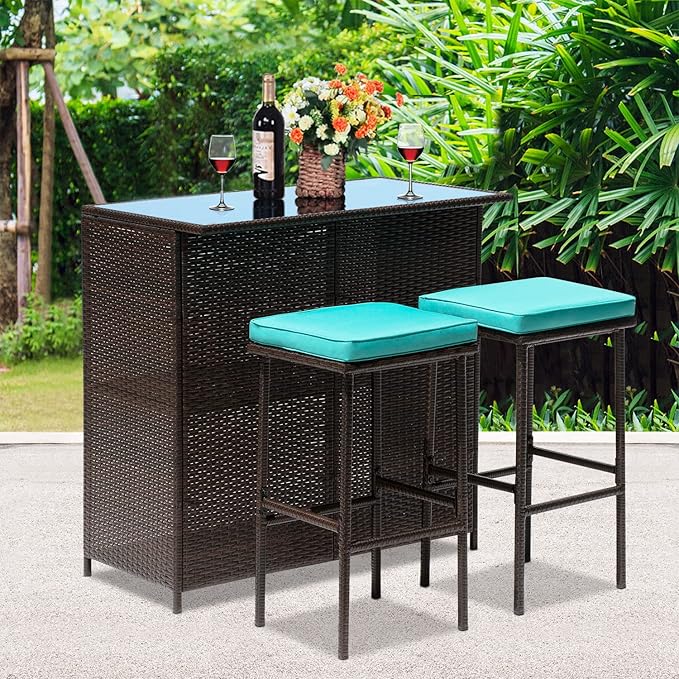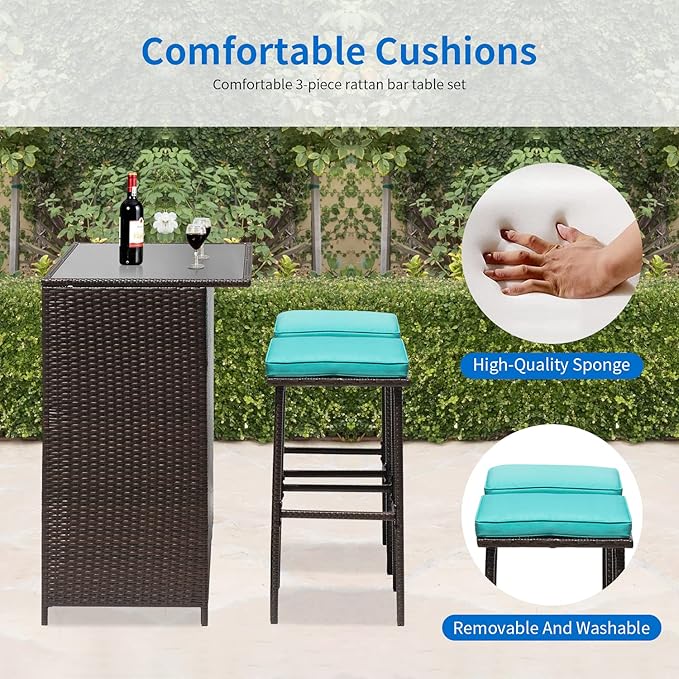 FDW 3PCS Patio Bar Set Outdoor Furniture Set Wicker Bistro Set with Two Stools for Patio Backyard Balcony,Blue Cushion