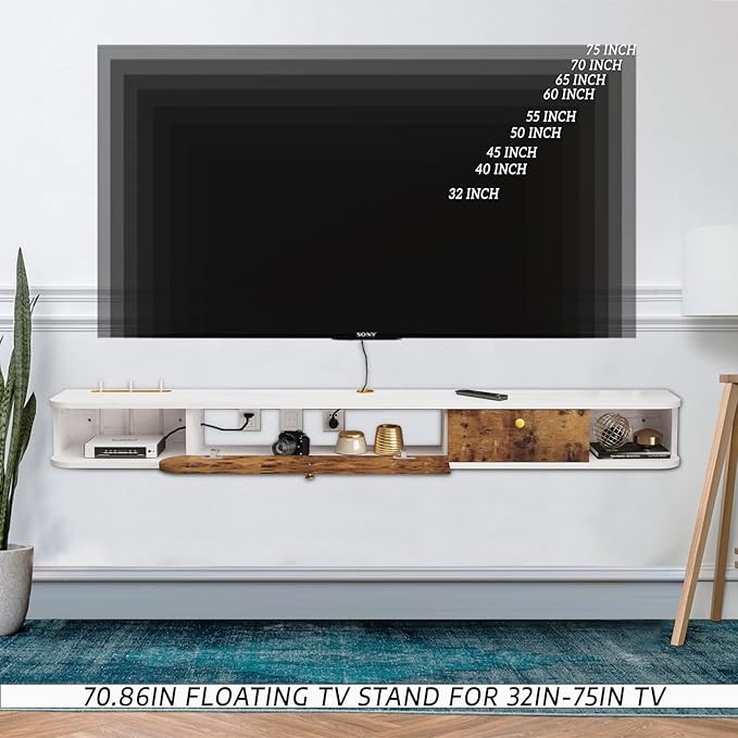 Floating TV Unit, 71'' Wall Mounted TV Cabinet, Floating Shelves with Door & Drawer, Farmhouse Entertainment Media Console Center Large Storage TV Bench for Living Room (71IN, Rustic Brown)