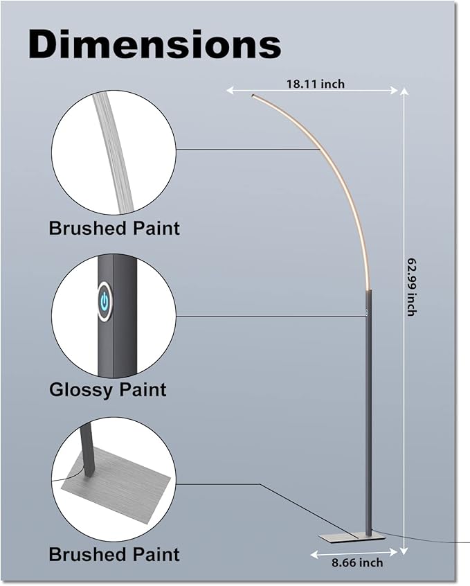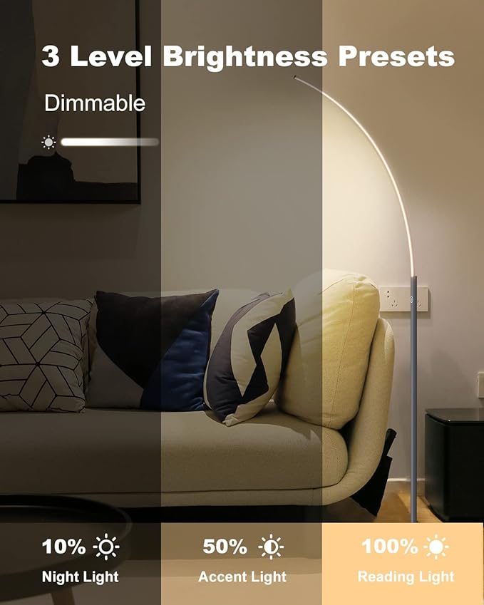 TACAHE Arc Corner Floor Lamp - 3000K Warm White & 3 Brightness Presets - Curved LED Accent Lamp with Touch Switch - 63" Modern Standing Lamp for Bedroom, Living Room - 12W - Silver