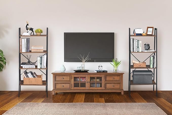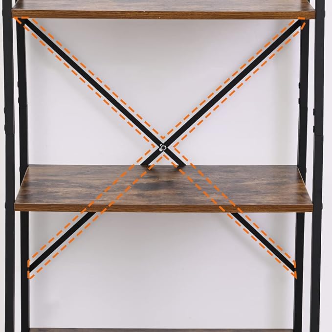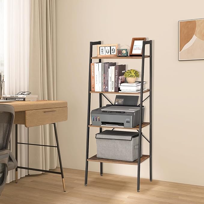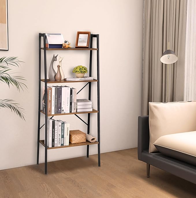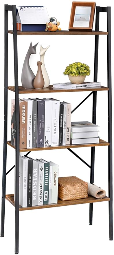 Ladder Shelf 4-Tier Bookcase Storage Rack, Steel Frame, Display Plant Shelves, Industrial Organizer Shelves for Living Room Kitchen Bathroom Office, Rustic Brown and Black