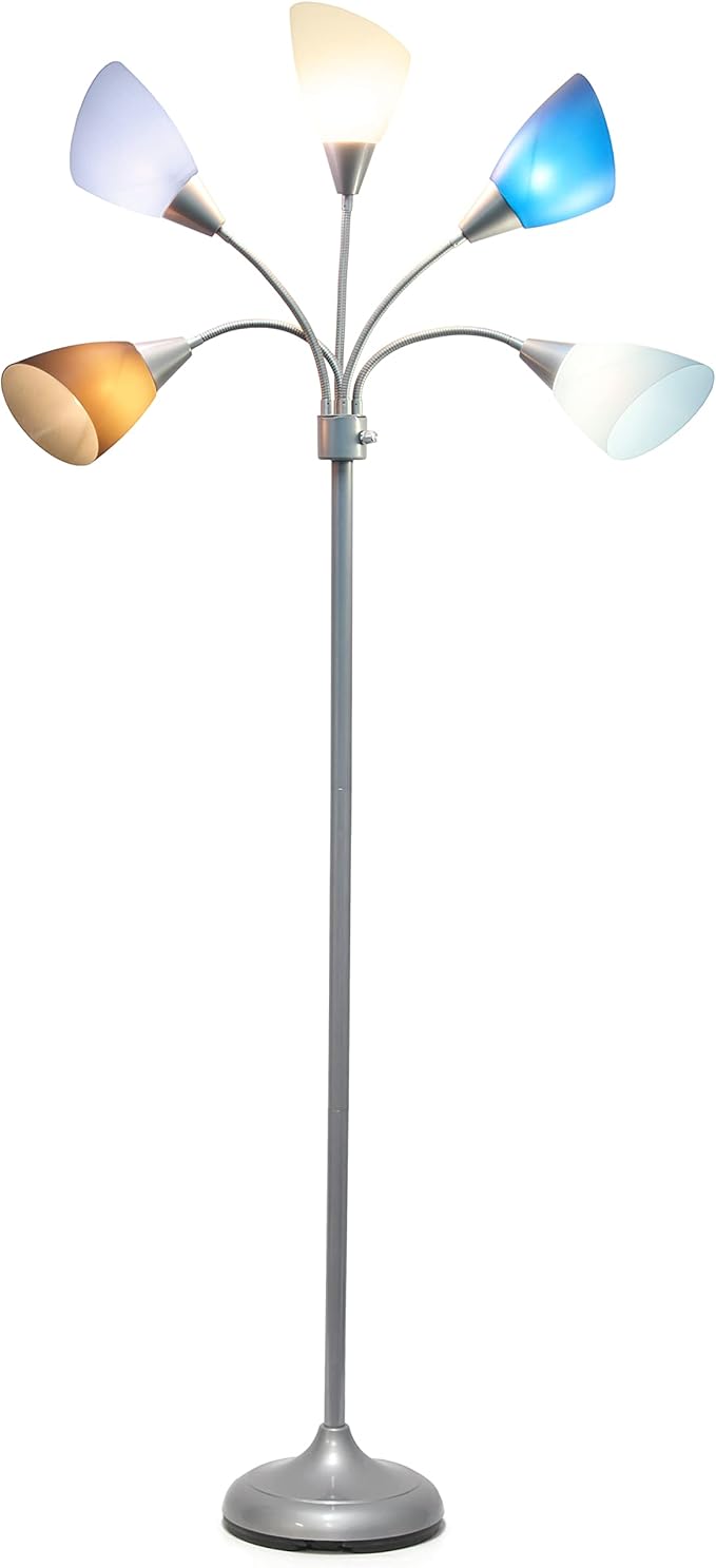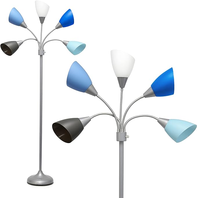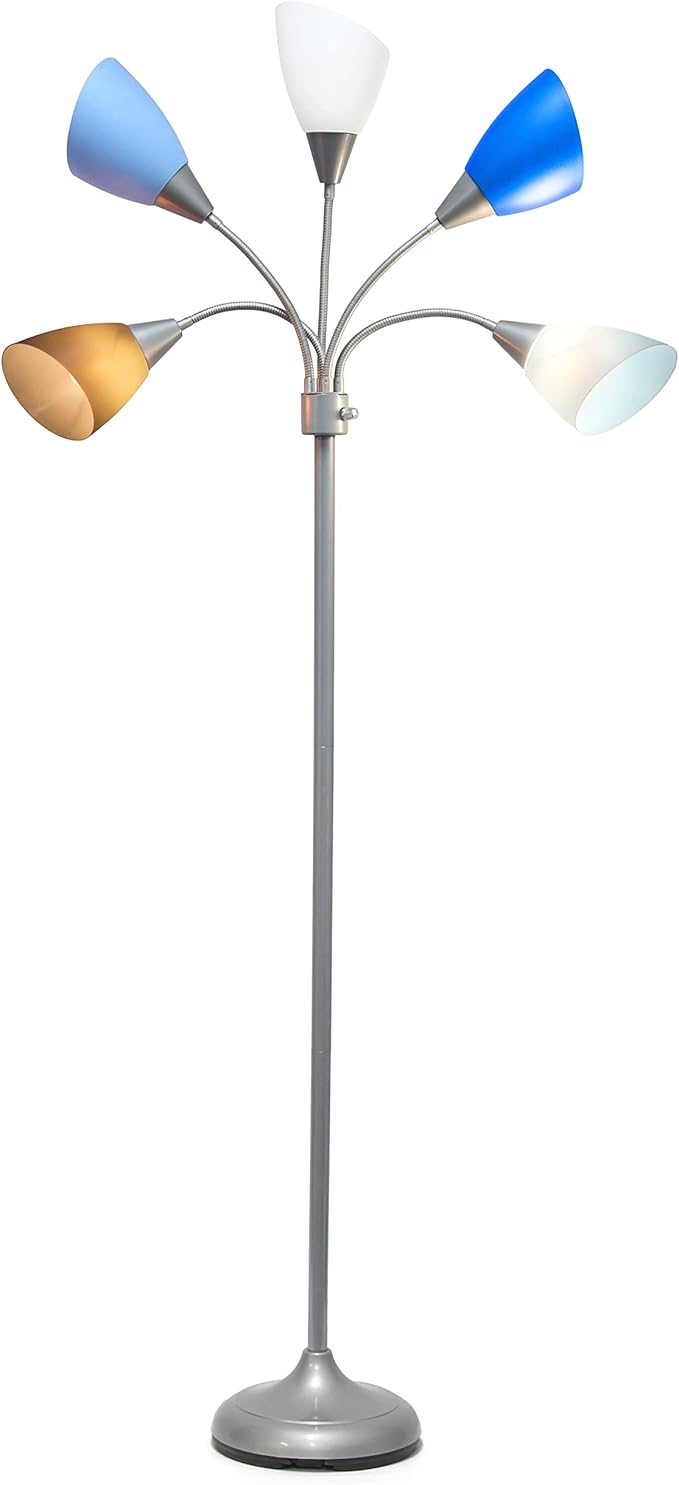 Simple Designs LF2006-SBG 67" Contemporary Multi Head Medusa 5 Light Adjustable Gooseneck Silver Floor Lamp with Blue, White, Gray Shades for Kids Bedroom Playroom Living Room Office