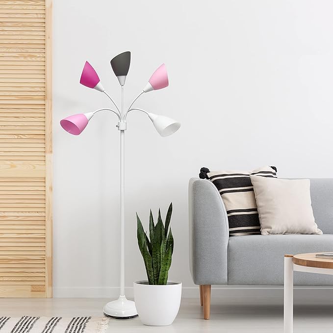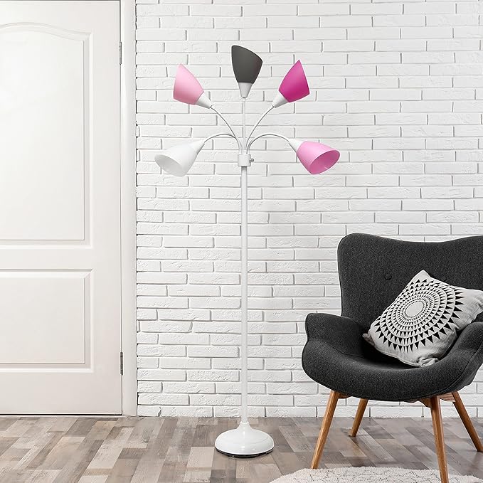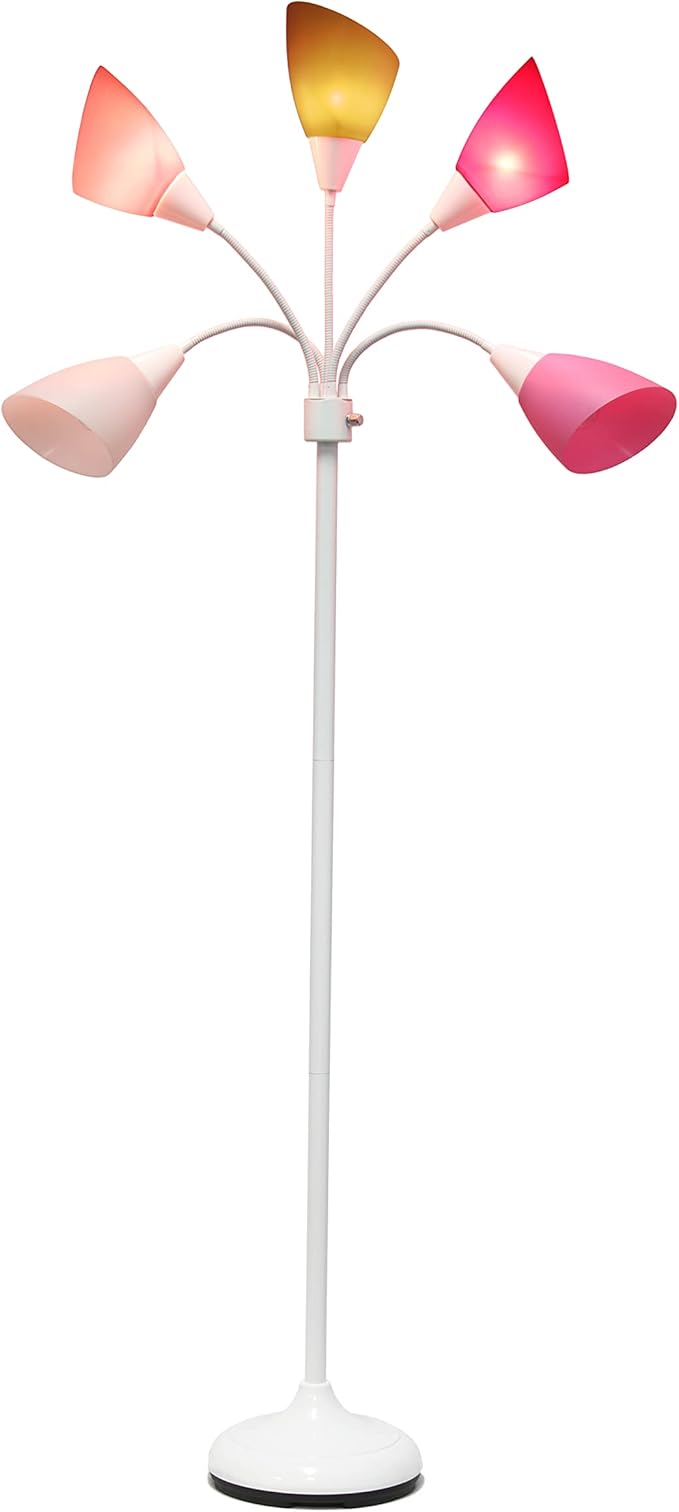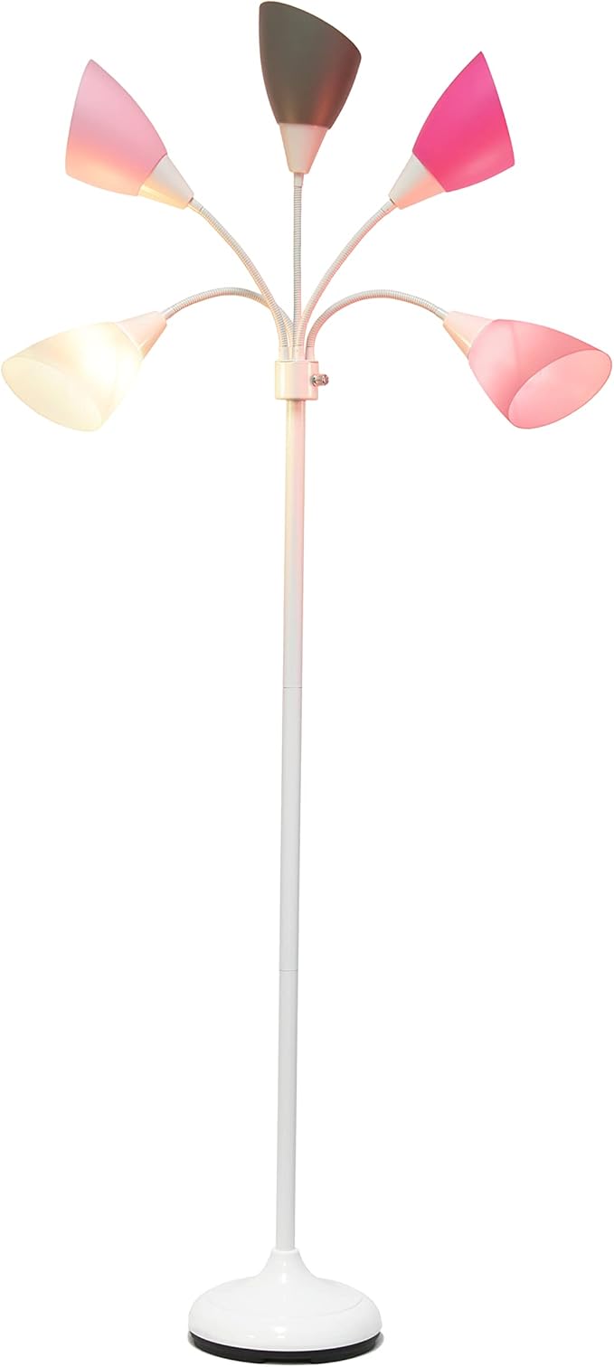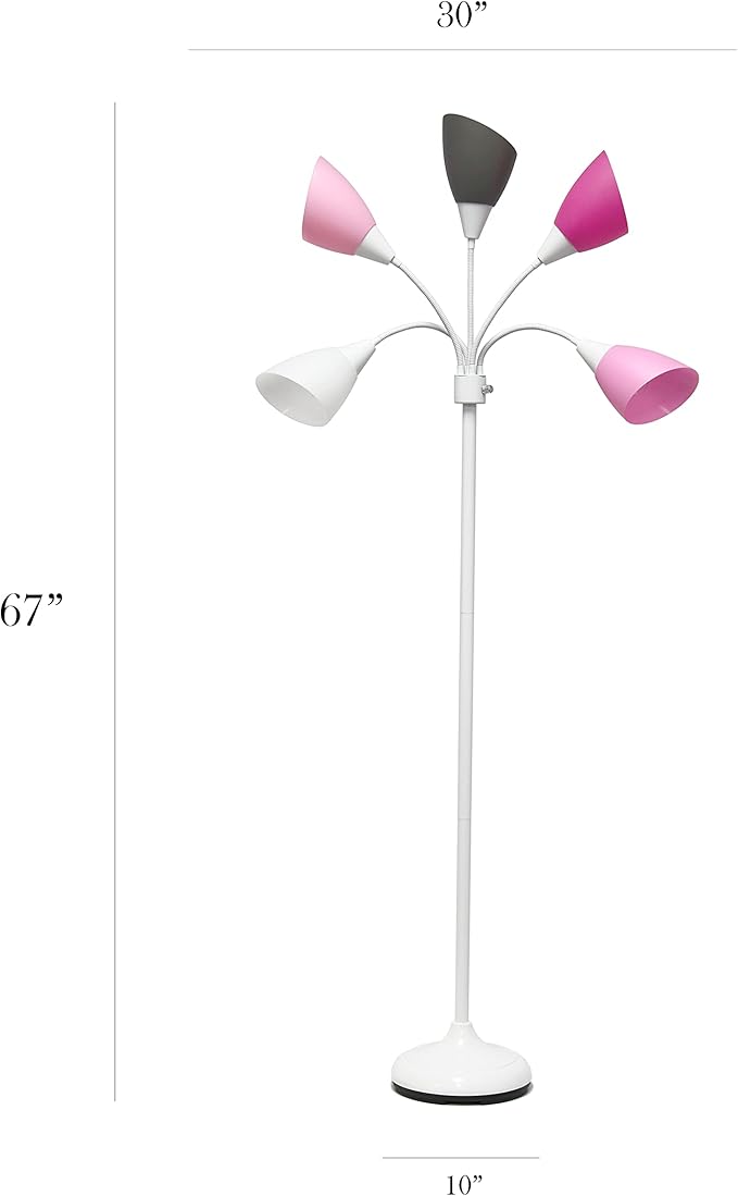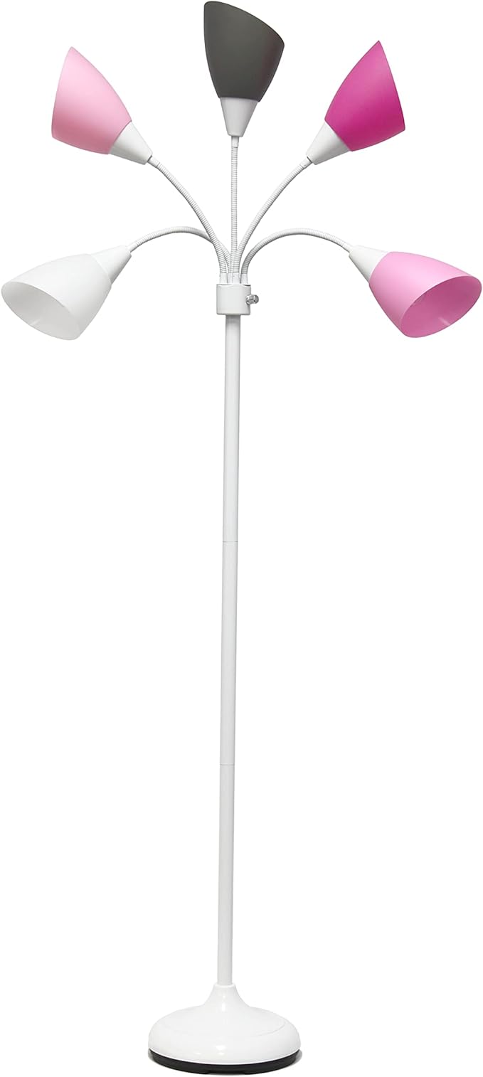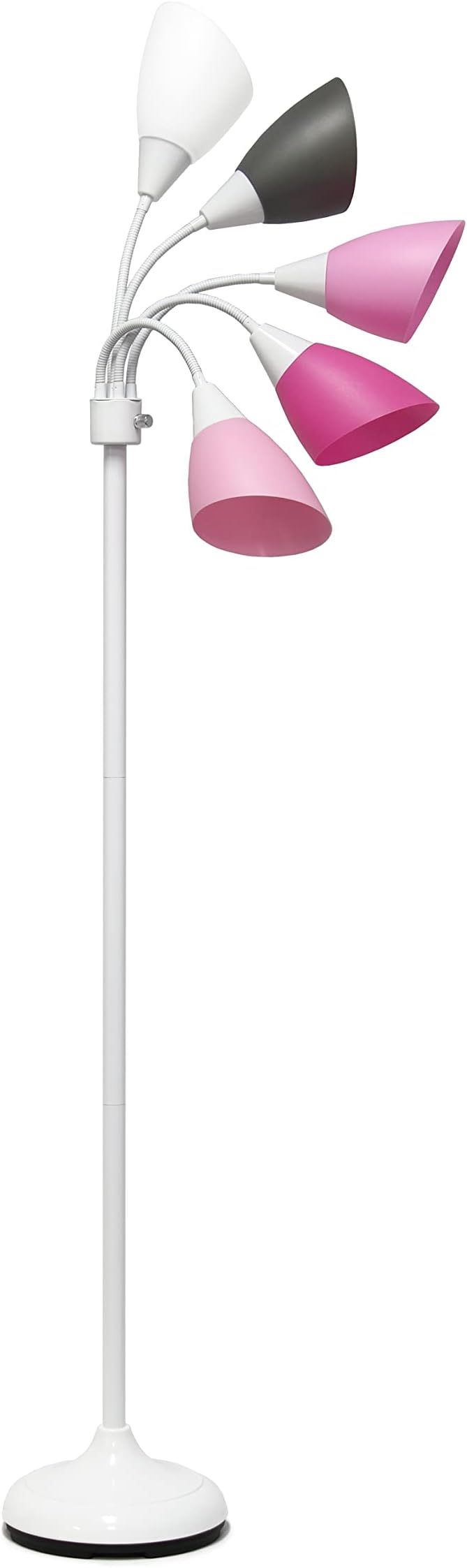 Simple Designs LF2006-WPG 67" Contemporary Multi Head Medusa 5 Light Adjustable Gooseneck White Floor Lamp with Pink, White, Gray Shades for Kids Bedroom Playroom Living Room Office, 30 x 10 x 67