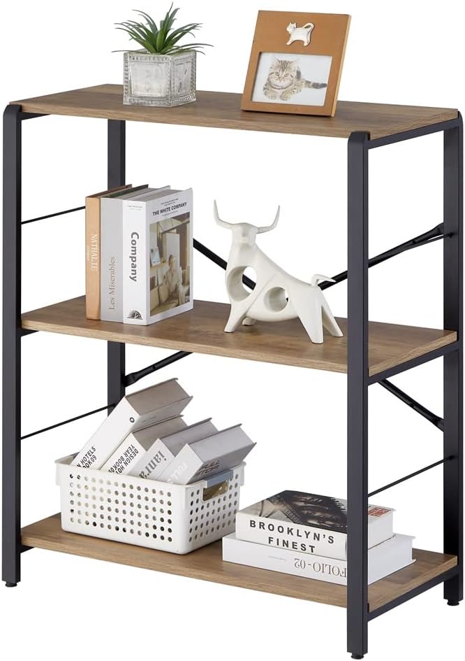 FOLUBAN Small Bookshelf, 3 Tier Open Book Shelf, Rustic Wood and Metal Shelving Unit for Small Space, Oak